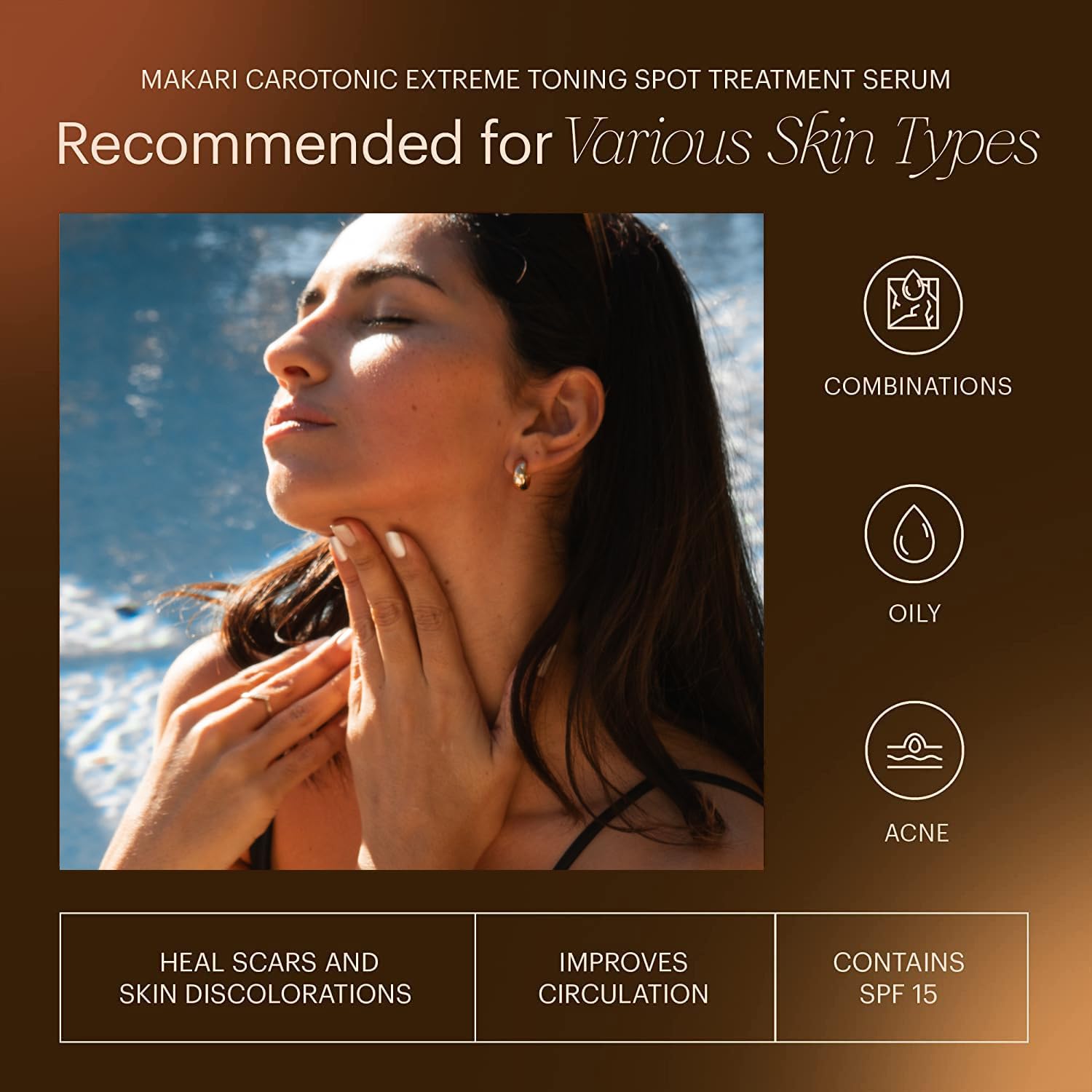 - ENHANCES YOUR GLOW: Makari Naturalle Carotonic Extreme Brightening Serum is a toning spot treatment for your face and body. It helps keep your skin supple and smooth with our special formulation of oils.