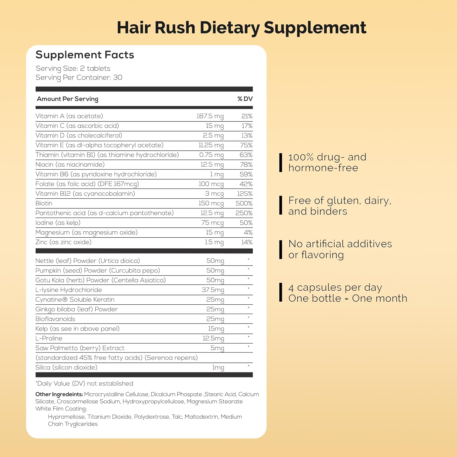 - PACKED WITH VITAMINS - Hair Rush is a cutting edge hair stimulating formula that is backed by scientific research. It has 23 essential hair vitamins, minerals and herbs that that address the underlying issues causing hair loss and make hair stronger, shinier and healthier than ever before.