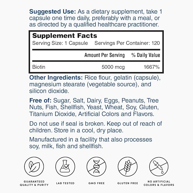 Nature's Lab Biotin 5000 mcg - Promotes Healthy Hair, Skin & Nails - 120 Capsules (4 Month Supply)