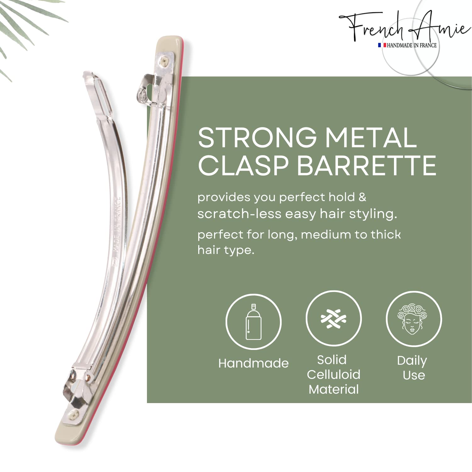 - Celluloid shiny finish with a sturdy clasp to keep your style in place all day long.