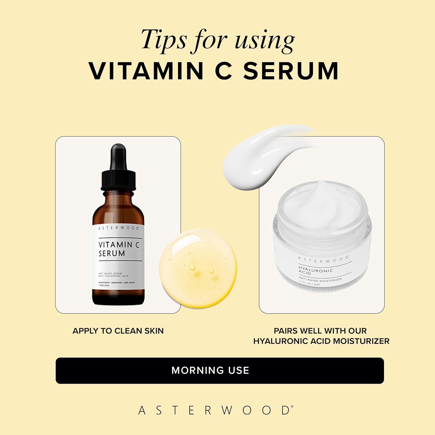 Asterwood Vitamin C Face Serum - with Hyaluronic Acid - Smoothing, Hydrating, Stimulates Collagen Production - Fragrance-Free - 1 Fl Oz