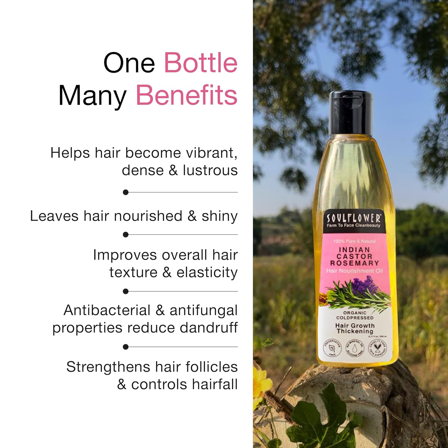 - FOR STRONG AND LUSTROUS HAIR: The Soulflower Castor Rosemary Hair Growth Oil nourishes and moisturizes dry hair, controls sebum, maintains a healthy scalp, improves hair texture, controls dandruff, and strengthens hair. The high-nutrient Soulflower Castor Rosemary Oil promotes a healthy scalp and long, thick, and lustrous hair.