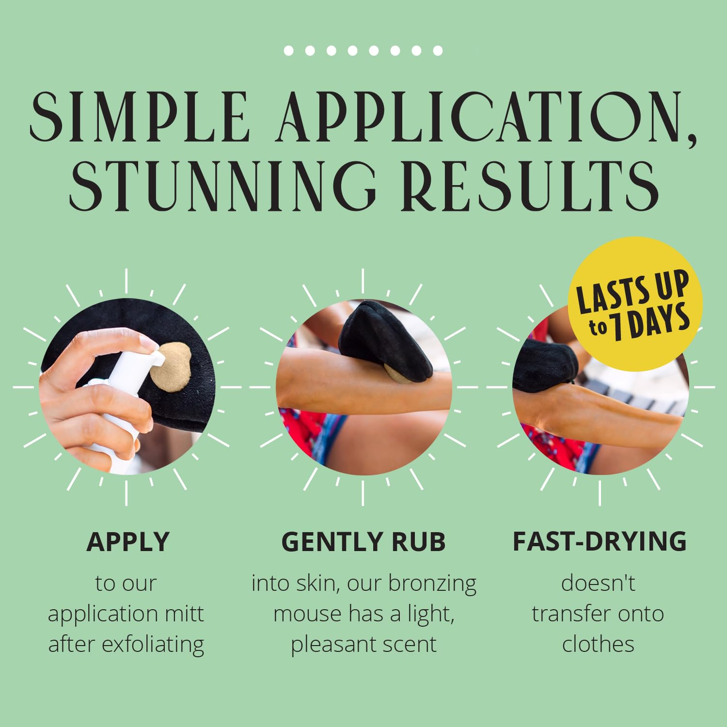 - Safe Sunless Tanner: Achieve a beautiful, glowy bronze tan without the sun; Our quick-drying self tanning mousse allows for precise application, guaranteeing a streak-free fake tan that lasts up to 7 days