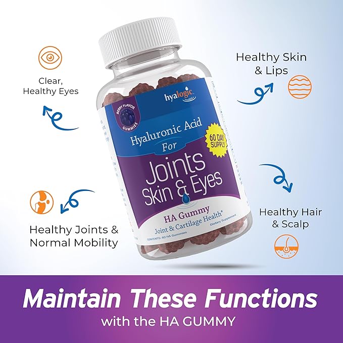 - SKIN SUPPORT: Hyalogic’s HA Gummy contains 60 mg of Hylaluronic Acid and is designed to work from the inside out, replenishing and hydrating the skin. This great tasting HA Gummy is an essential part of your beauty routine, providing a natural glow starting from within. The unique formula helps promote vibrant hair, healthy nails and glowing skin.*
