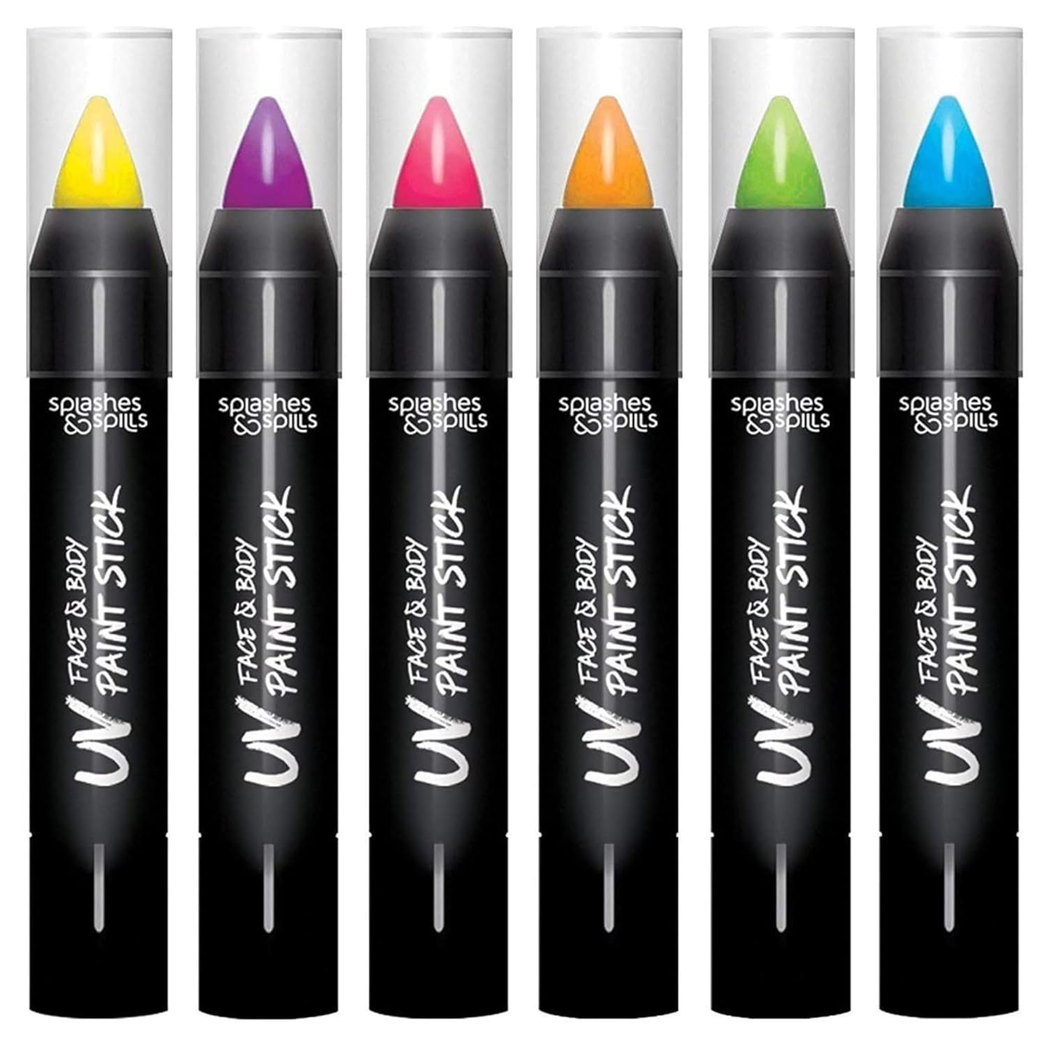 Splashes & Spills UV Face and Body Paint Sticks - UV Body Paint, UV Face Paint for Costume, Cosplay, Theater, Club - Glows Under UV Light - Black Light Paint For All Skin Types (6 Colors)