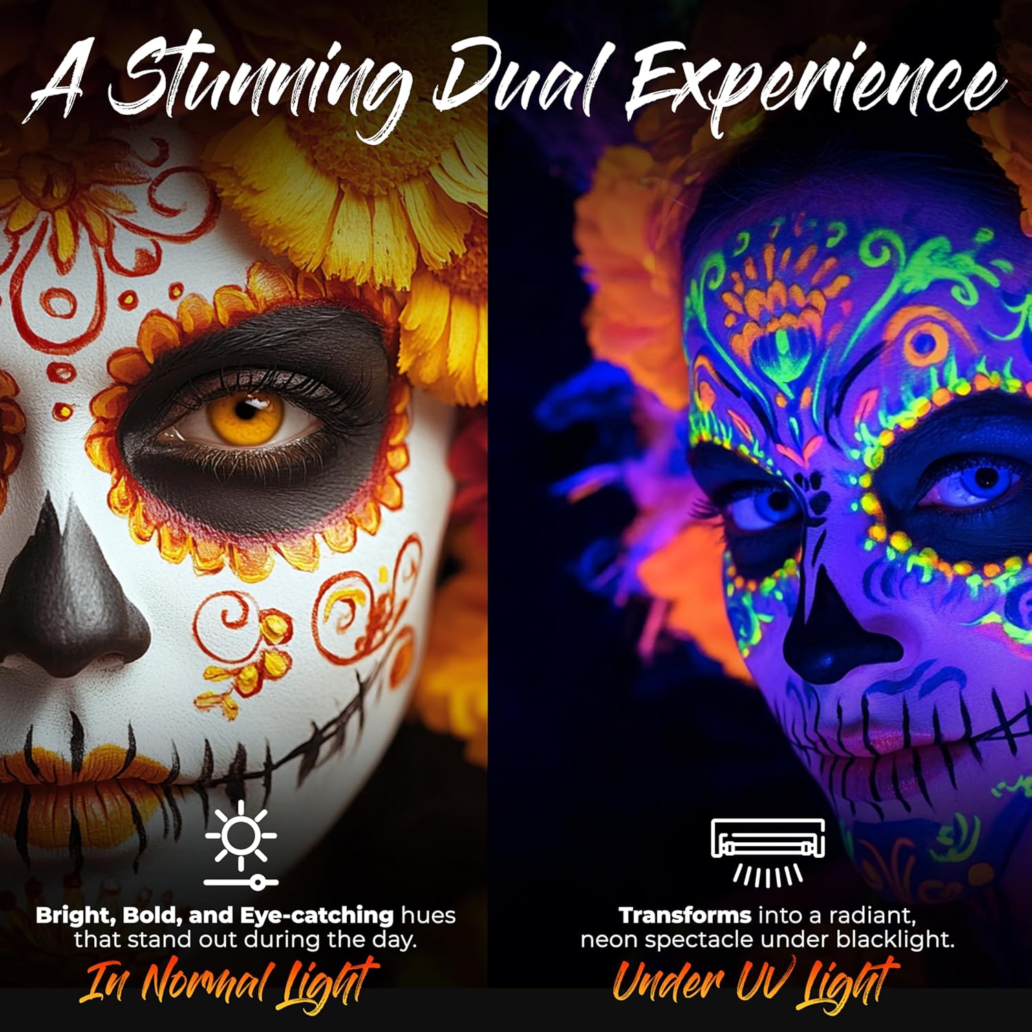 - GENTLE ON SKIN: Our blacklight makeup has undergone rigorous testing on human skin, ensuring its safety and harmlessness. Feel confident using it as both black light body paint and face paint markers, knowing it won't cause any damage to your skin.