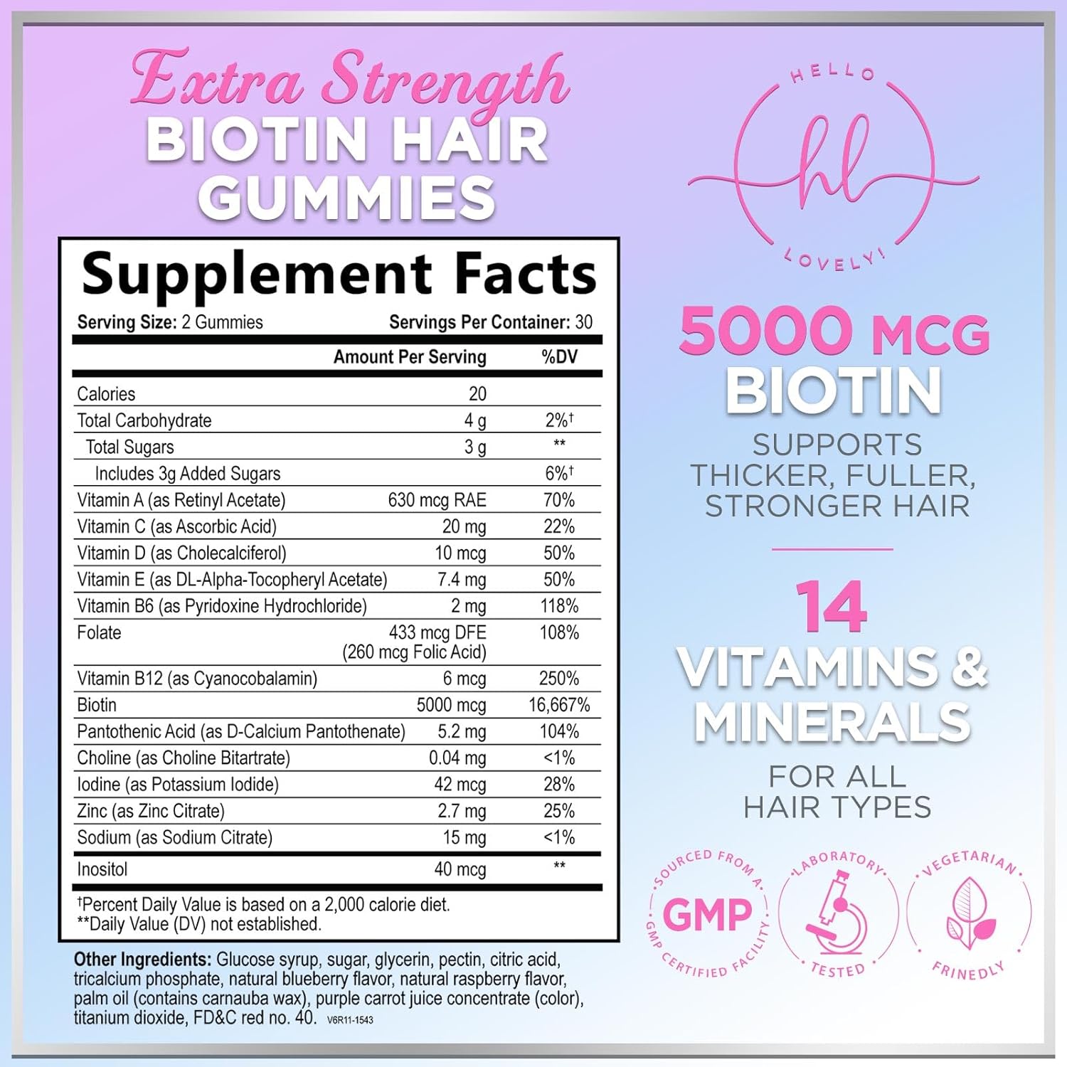- HAIR GUMMY VITAMINS: Hello Lovely! Hair Vitamins Gummies pack 5000 mcg of Biotin, plus Vitamins E & C and zinc, to support luscious hair growth