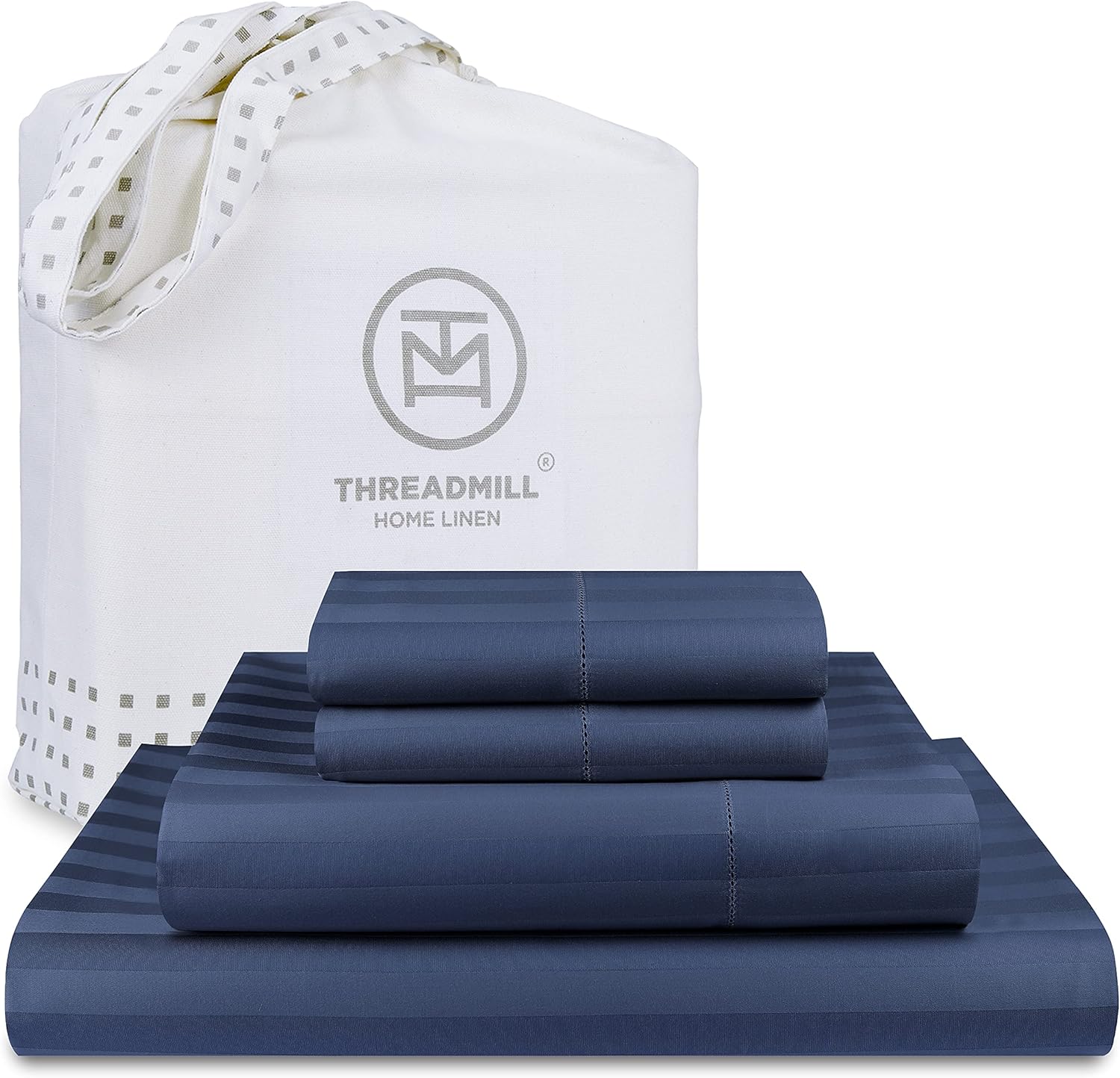 Threadmill 500 Thread Count Queen Size Damask Stripe, 4 Pc Luxury Cotton Sheet Set, Silky Smooth Folkstone Blue Sheets with 16" Elasticized Deep Pocket, 2 Pillowcases & Free Tote Bag