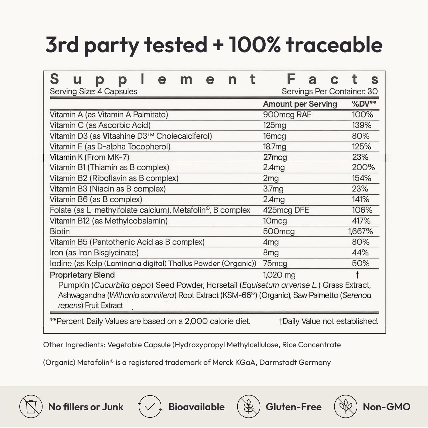 - Adaptogenic Stress Support Formula - Powered by organic ashwagandha, this hair vitamin helps balance cortisol, a stress hormone linked to thinning, making it a smart choice among men's and women's hair growth supplements.*