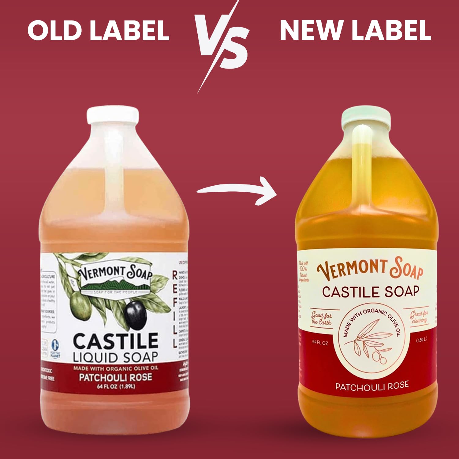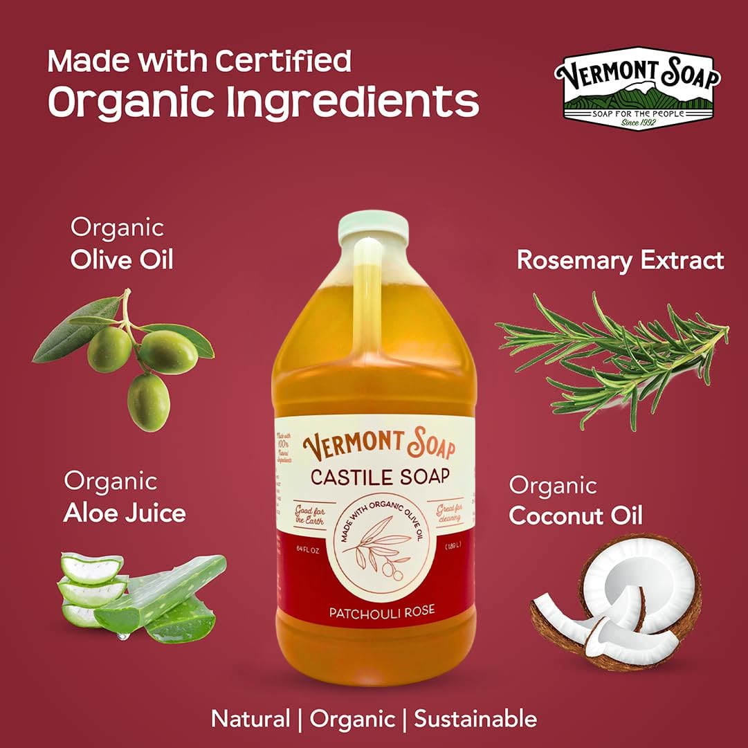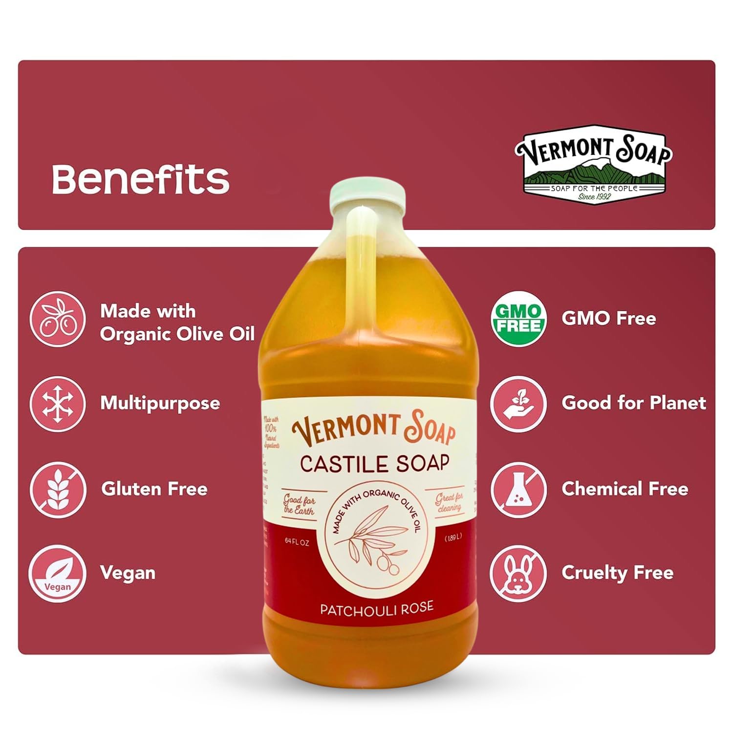 Vermont Castile Soap Patchouli Rose, Gentle Liquid Soap for Sensitive Skin & Natural Body Wash, Organic Hair Shampoo for Oily Hair, Aloe Castile Soap for Men & Women - 64 Oz