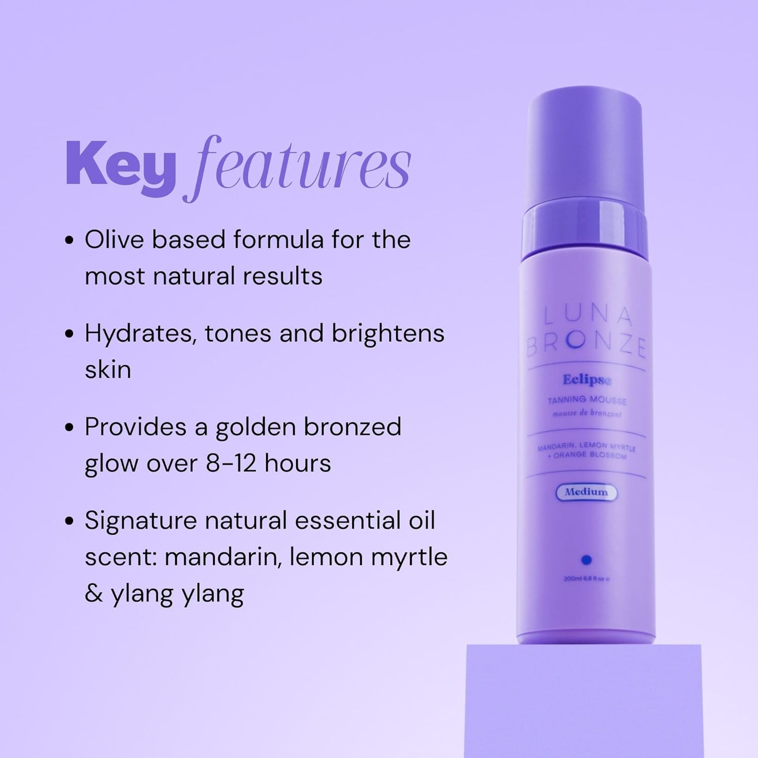 Luna Bronze Eclipse Self Tan Mousse (Medium) | Streak Free Natural Sunless Tanner, Devlops a Golden Tan Over 6-8 Hours | Lightweight Formula with Organic Aloe Vera | Australian Made (200ml/6.7 fl. oz)
