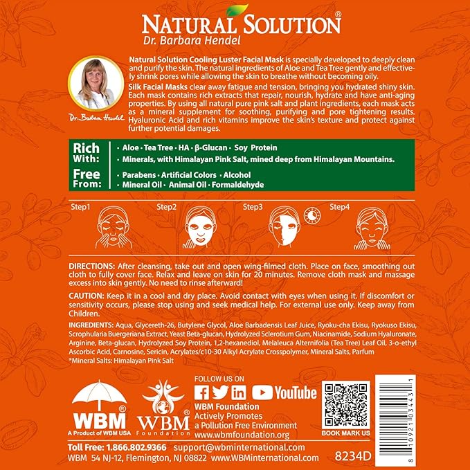 Natural Solution Cooling Luster Silk Facial Mask With Aloe & Tea Tree,Deep Pore Cleansing Face Mask,Instant Brightening and Hydrating - 10 PK