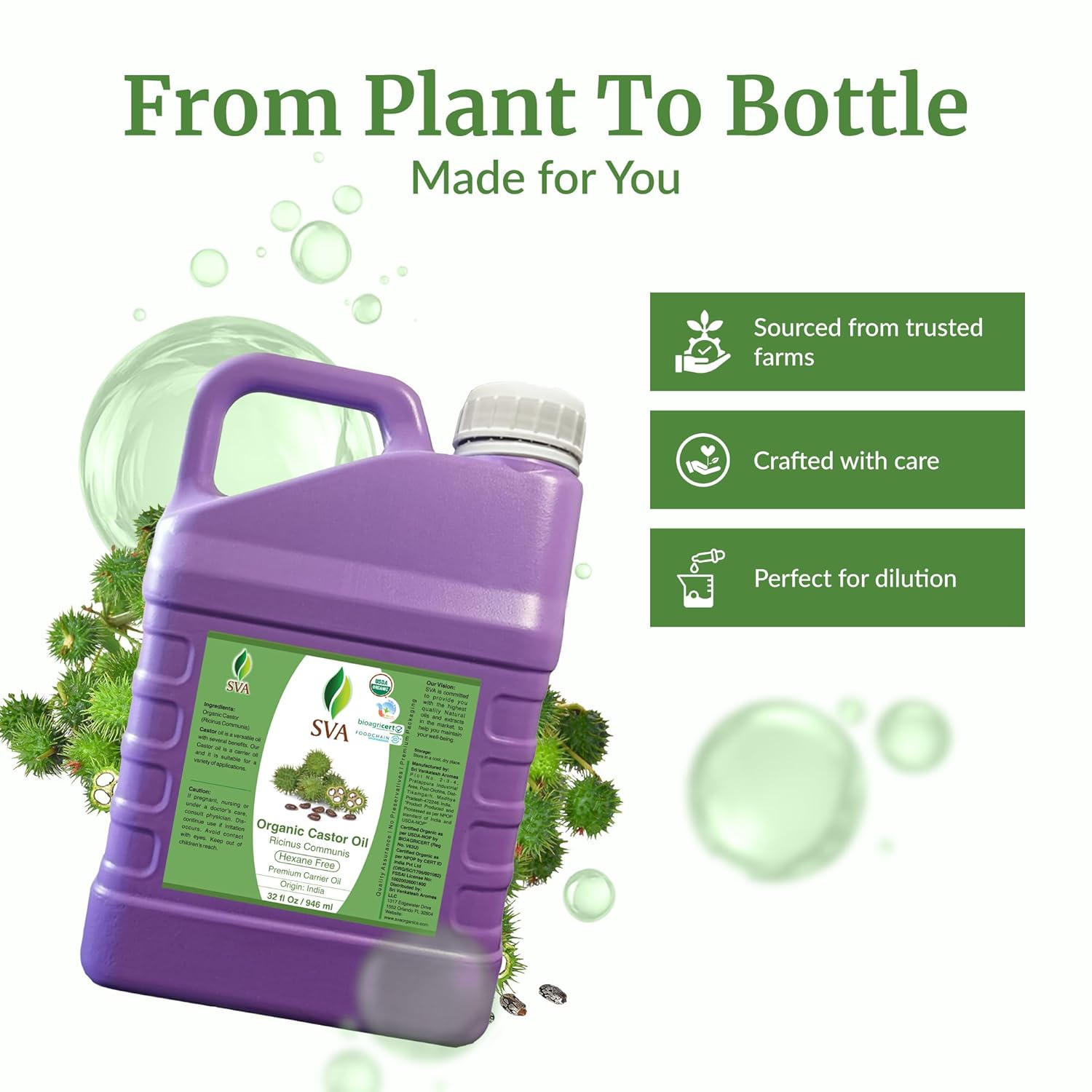 - Premium High-Quality Organic Castor Carrier Oil: SVA Castor Oil is obtained by cold-pressed extraction of Ricinus Communis seeds. Our Castor oil is Hexane-free and free of preservatives. It is not tested on Animals. We care for you.