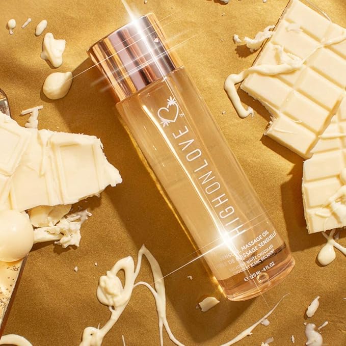 HIGHONLOVE Natural Body Oil with Hemp Seed, Grape Seed, and Vitamin E Oil - Moisturizing Body Oil, Non-Greasy, Glowy Finish (120 ml) (Decadent White Chocolate)