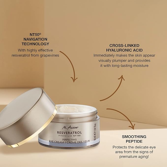 - WHAT IT DOES: Thanks to the NT50-navigation-technology developed exclusively for M. Asam, the rejuvenating resveratrol is delivered precisely to the skin cells and can positively influence the release of sirtuins - the so called youth enzymes. The formulation, which is specially formulated for the sensitive eye area, leaves the skin feeling noticeably soft and smooth.