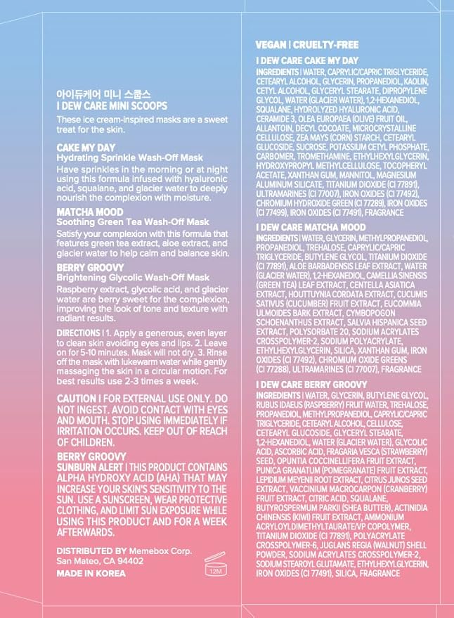 - TRIPLE THE FLAVOR: Can’t decide on just one? Try them all with this trio of our yummy ice cream-inspired wash-off masks! Includes Cake My Day, Berry Groovy, and Matcha Mood, all in 10g (0.35 oz.) tubs.