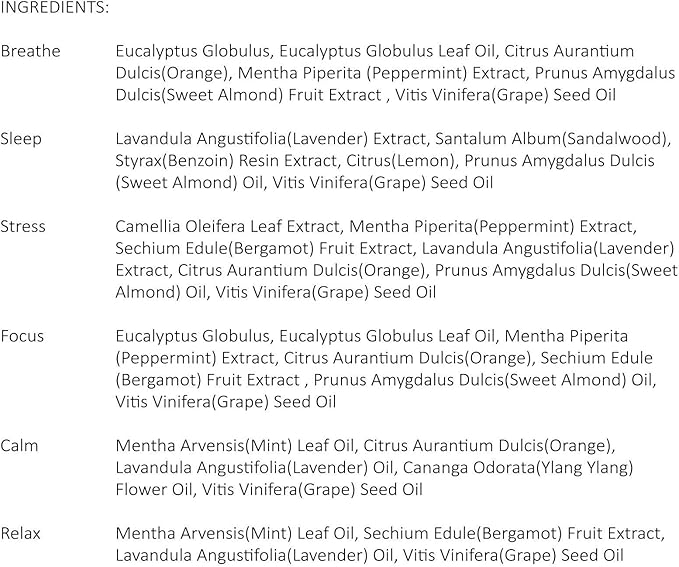 - 1. SIX NATURAL ROLL-ON BLENDS - Our essential oils set includes 6 packs of 0.33fl.oz/10ml amber roller bottles, each containing a unique blend for Breathe, Sleep, Stress, Focus On, Calming and Relaxation.