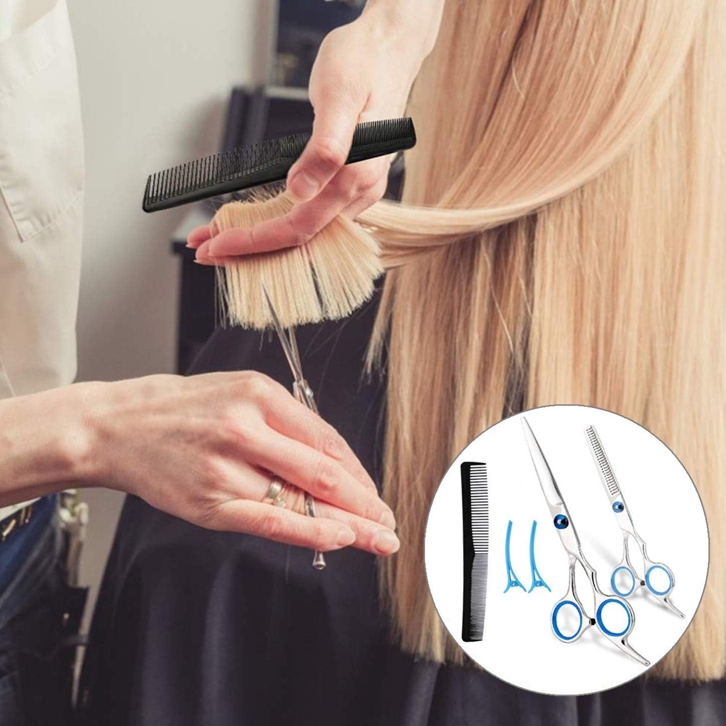 - SIZE: 6 Inch,Package with a leather case.included 1 Hair Cutting Scissors , 1 Thinning Shears,1 Hair Comb,1 x Cleaning Cloth, 2 Clips. The cutting scissors are precision micro serrated, extremely sharp