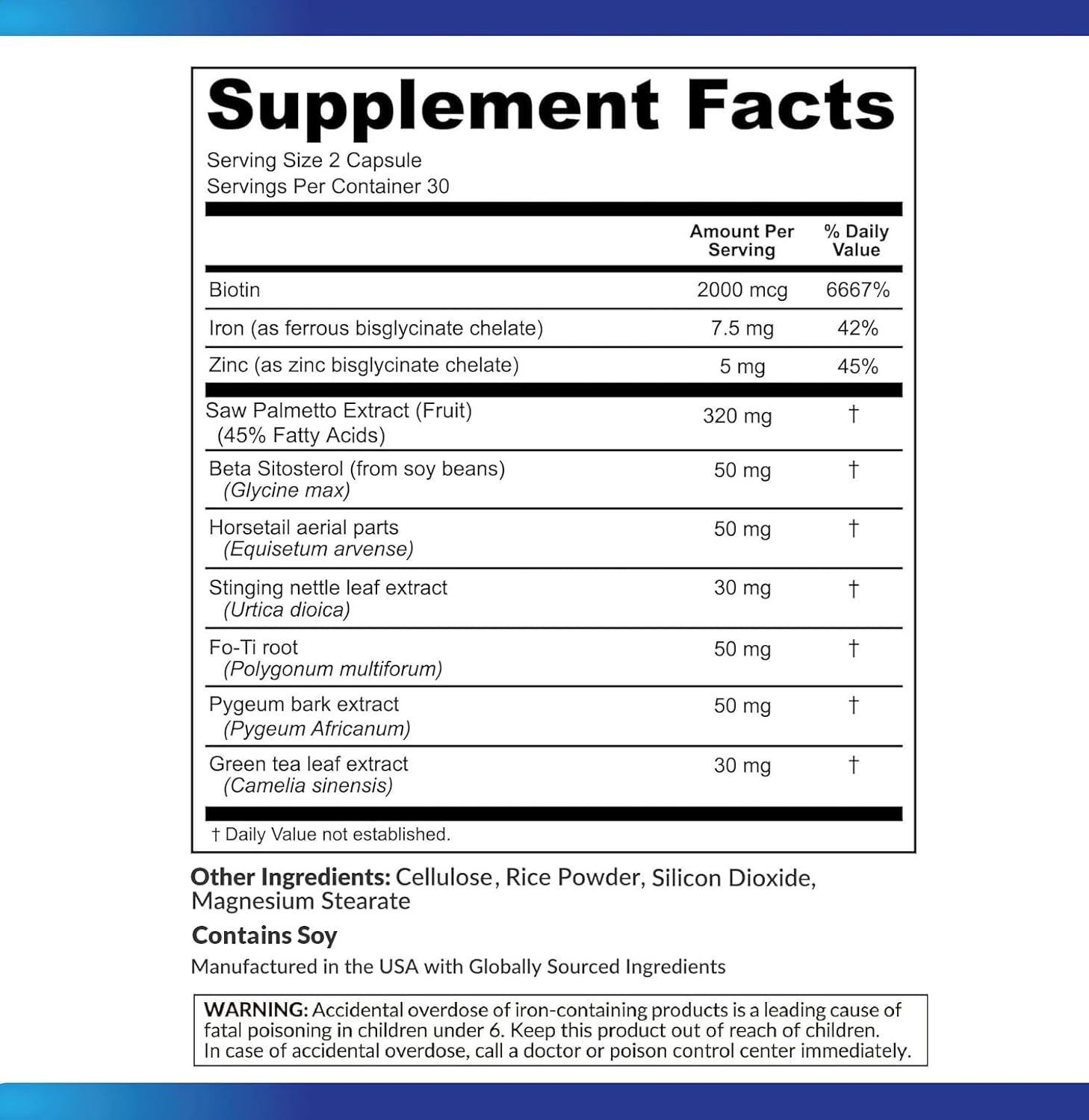 - Healthy Hair Growth Support - Our Premium Hair Support Supplement contains key ingredients (iron, biotin, zinc, saw palmetto) and other ingredients to support your healthy hair. Great support for hair types of all kinds - For both Men and Women One Month Supply