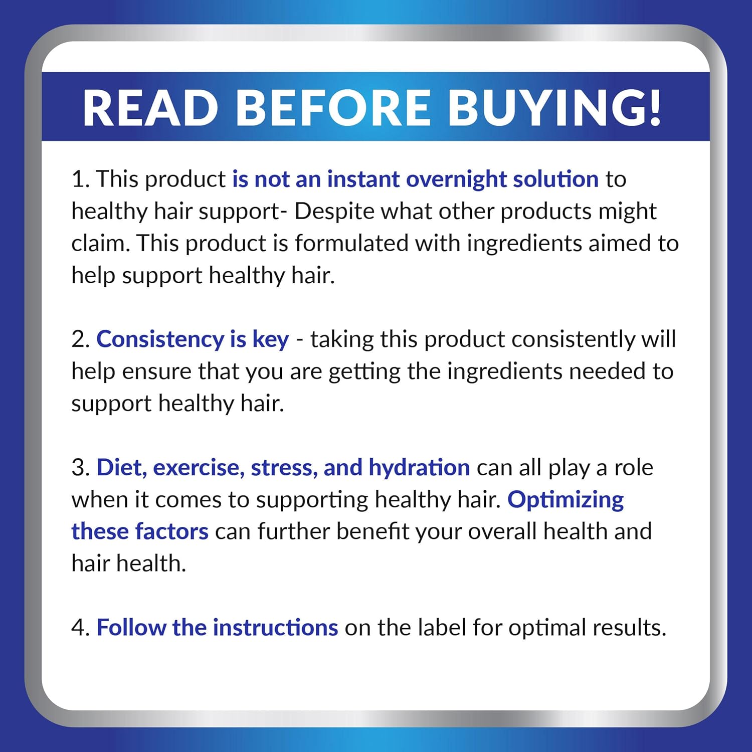 - Healthy Hair - Our Supplement is great for those who want to support healthy hair, skin & nails, and want to make a step in the right direction. Our Hair vitamins supplement comes with a convenient box! Perfect for Both Women and Men