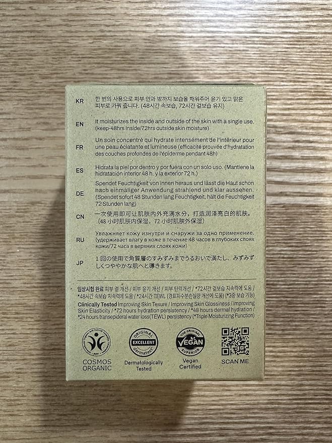 - CERTIFIED & CLINICALLY PROVEN : COSMOS ORGANIC, DERMATEST-EXCELLENT, and VEGAN Certified. Demonstrated 72-hour surface hydration, 48-hour dermal hydration, 24-hour TEWL improvement, and proven enhancements in texture, glossiness, and elasticity.