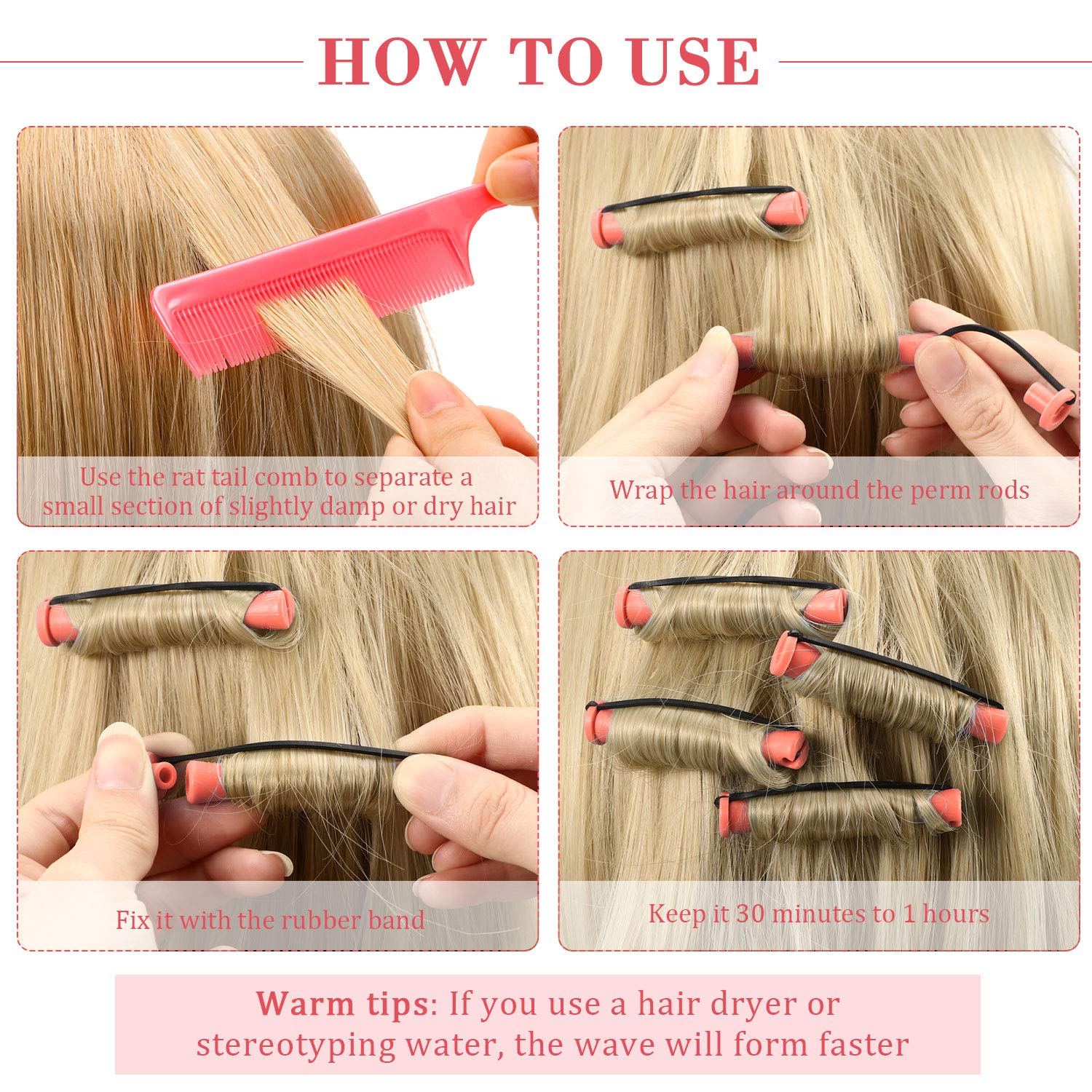 - Steps to apply: what you need to do is use the pintail comb to separate a small strand of slightly damp or dry hair, wrap it on the rods, then use the rubber band to fix it, no need heating, so it won't hurt your hair, wait for a while and you can get a charming curly hair, you can also adjust the direction when rolling your hair on the rods and you can create various styles of hair waves