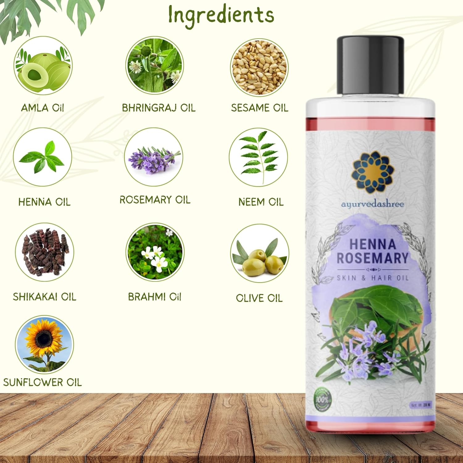 - Ingredients : Henna Oil, Rosemary Oil, Neem Oil, Shikakai Oil, Bhringraj Oil, Amla Oil, Brahmi Oil, Sesame Oil, Olive Oil, Sunflower Oil