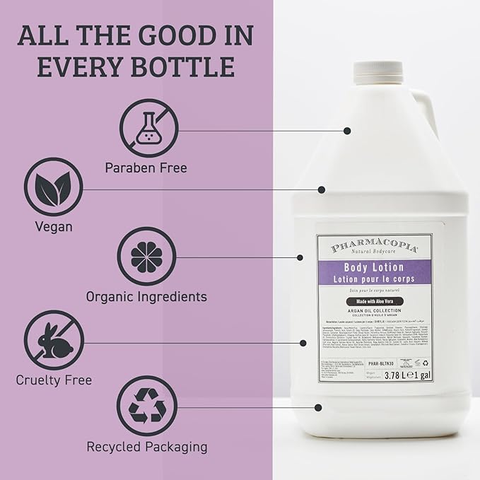 - NATURAL FORMULA: Our galoon-size Argan Oil body lotion contains natural and organic ingredients in a biodegradable formula free from parabens, sulfates, phthalates, and synthetic fragrance and dyes