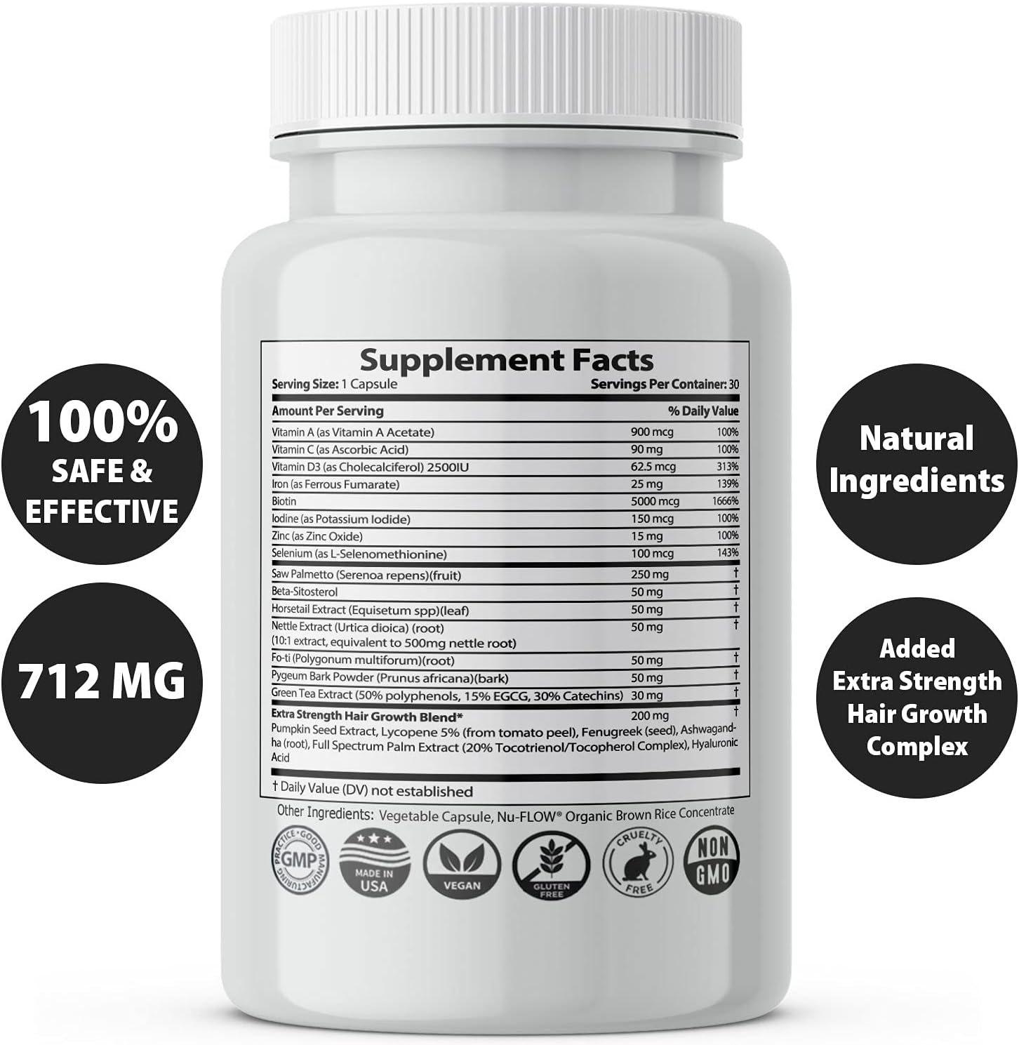 - Special Ingredients : Vitamin A, Vitamin C, Vitamin D3, Iron, Biotin, Iodine, Zinc, Selenium, Saw Palmetto, Beta-Sitosterol, Horsetail Extract, Nettle Extract (Urtica dioica) (root) (10:1 extract, equivalent to 500mg nettle root), Fo-ti (Polygonum multiforum)(root), Pygeum Bark Powder, Green Tea Extract (50% polyphenols, 15% EGCG, 30% Catechins), Pumpkin Seed Extract, Lycopene, Fenugreek (seed), Ashwagandha (root), Full Spectrum Palm Extract (20% Tocotrienol/Tocopherol Complex), Hyaluronic Acid, Vitamin A, Vitamin C, Vitamin D3, Iron, Biotin, Iodine, Zinc, Selenium, Saw Palmetto, Beta-Sitosterol, Horsetail Extract, Nettle Extract (Urtica dioica) (root) (10:1 extract, equivalent to 500mg nettle root), Fo-ti (Polygonum multiforum)(root), Pygeum Bark Powder, Green Tea Extract (50% polyphenols, 15% EGCG, 30% Catechins), Pumpkin Seed Extract, Lycopene, Fenugreek (seed), Ashwagandha (root), Full Spectrum Palm Extract (20% Tocotrienol/Tocopherol Complex), Hyaluronic Acid, Vegetable Capsule, Nu-FLOW Organic Brown Rice Concentrate Vitamin A, Vitamin C, Vitamin D3, Iron, Biotin, Iodine, Zinc, Selenium, Saw Palmetto, Beta-Sitosterol, Horsetail Extract, Nettle Extract (… See more