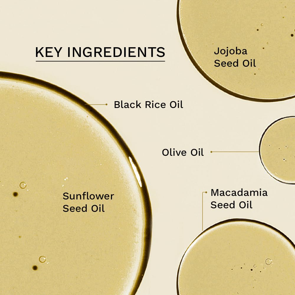 - REVITALIZE WITH BLACK RICE: Our cleansing oil nourishes with proteins and minerals. Jojoba, Macadamia, Olive, and Sunflower oils provide a radiant boost.