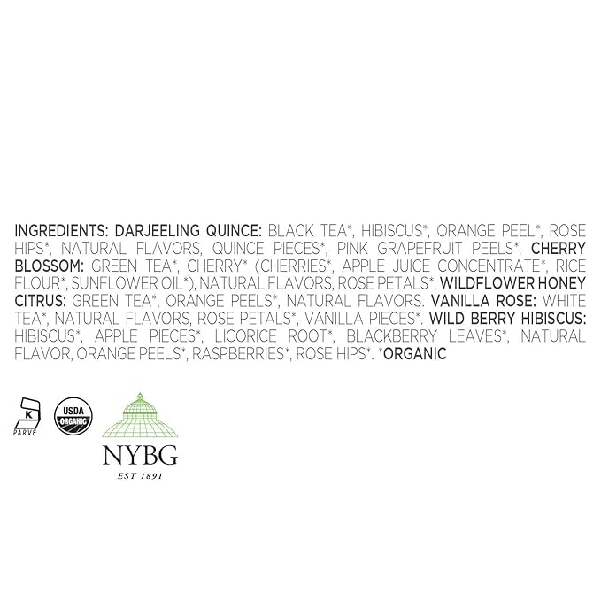 - SOPHISTICATED COLLECTION includes five USDA organic and kosher certified tea blends, two of each blend: Darjeeling Quince (black tea), Cherry Blossom (green tea), Wildflower Honey Citrus (green tea), Vanilla Rose (white tea), Wildberry Hibiscus (herbal tea)