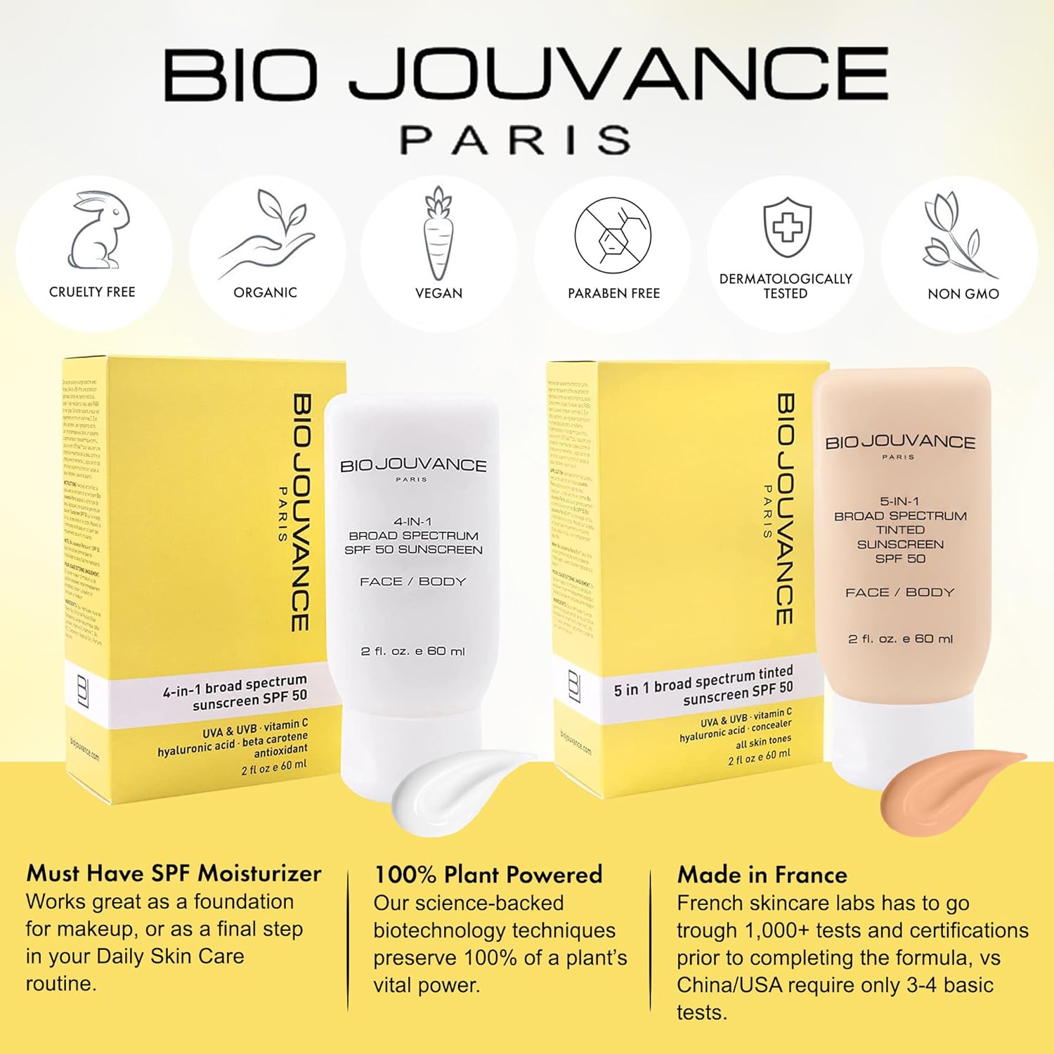 - BROAD SPECTRUM SPF 50 FOR EXCEPTIONAL PROTECTION – With broad-spectrum UVA and UVB filters, the Bio Jouvance Paris 4-in-1 SPF 50 Sunscreen provides optimal protection against the sun’s damaging rays