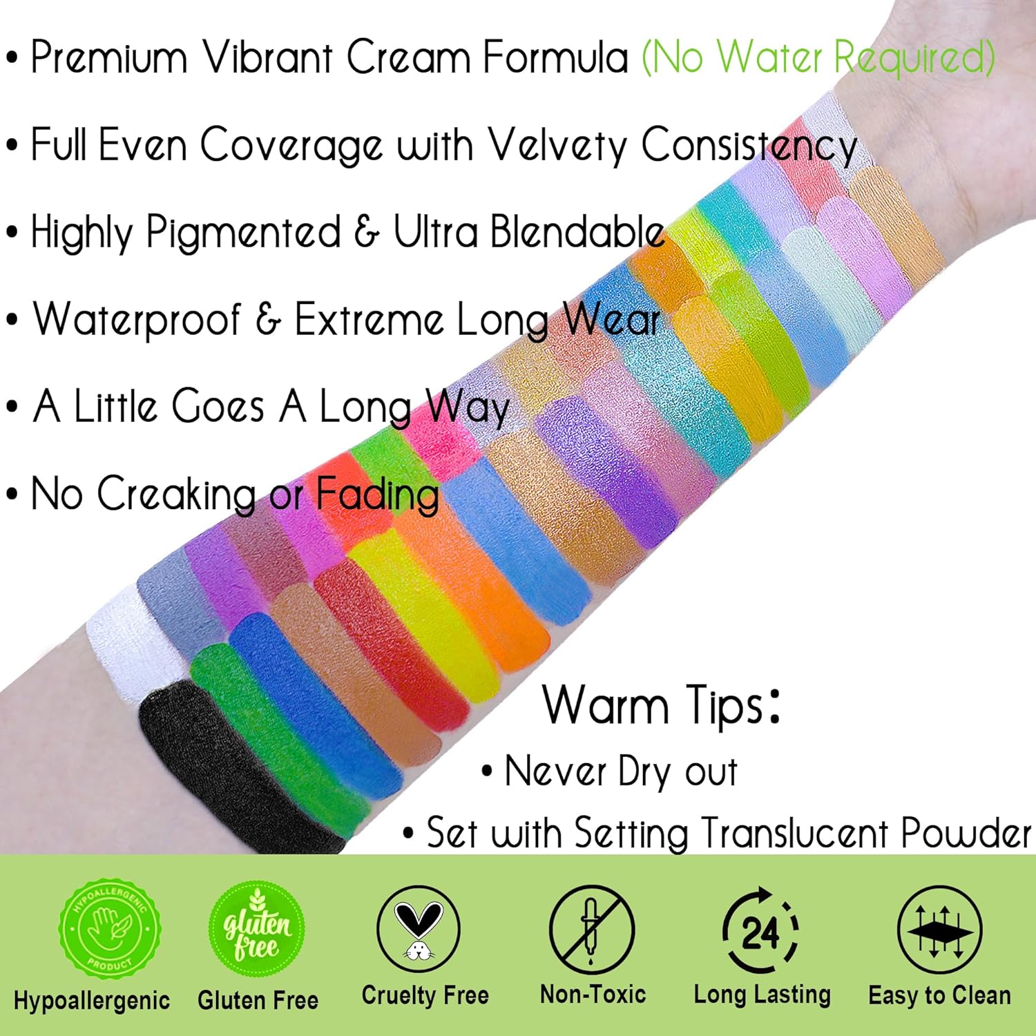 - 36 BRIGHT COLORS & BEST CREME FACE PAINTING KIT - Includes 36 premium vibrant colors that are striking without cracking,comes with 10pcs high quality artist brushes.With a great selection of colors, Such as 22 Vivid Classic + 8 Metallic + 6 Neon UV Glow Colors which is reactive under UV or Black light. Best & Big enough to meet the needs of different occasions. Even more, effortlessly blend them for over 36+ amazing colors to create more paintings with your endless imaginations.