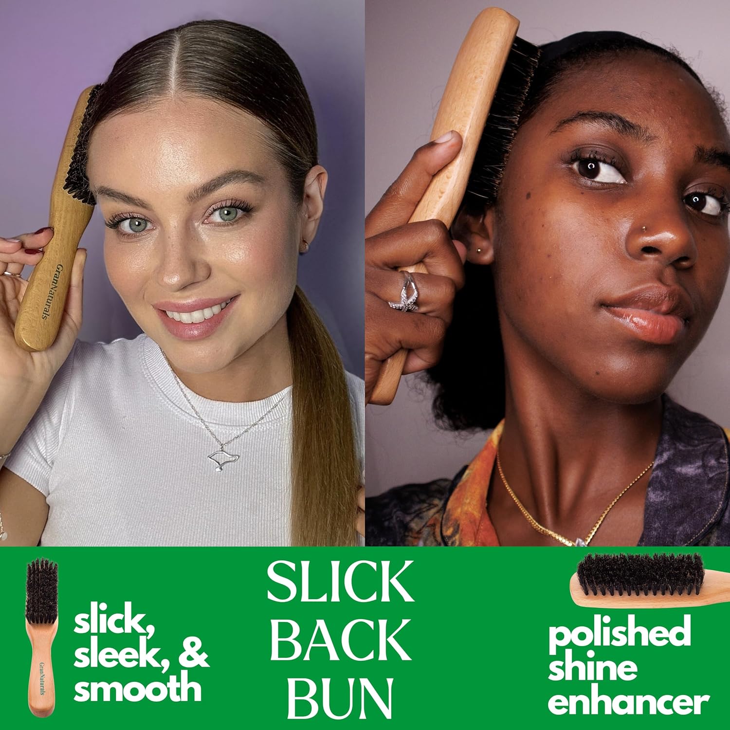 GranNaturals Boar Bristle Slick Back Hair Brush - Soft/Medium Smoothing Hairbrush to Style, Polish, & Lay Hair Down Flat to Create a Sleek Frizz Free Hairstyle for Women and Men - Wooden Handle