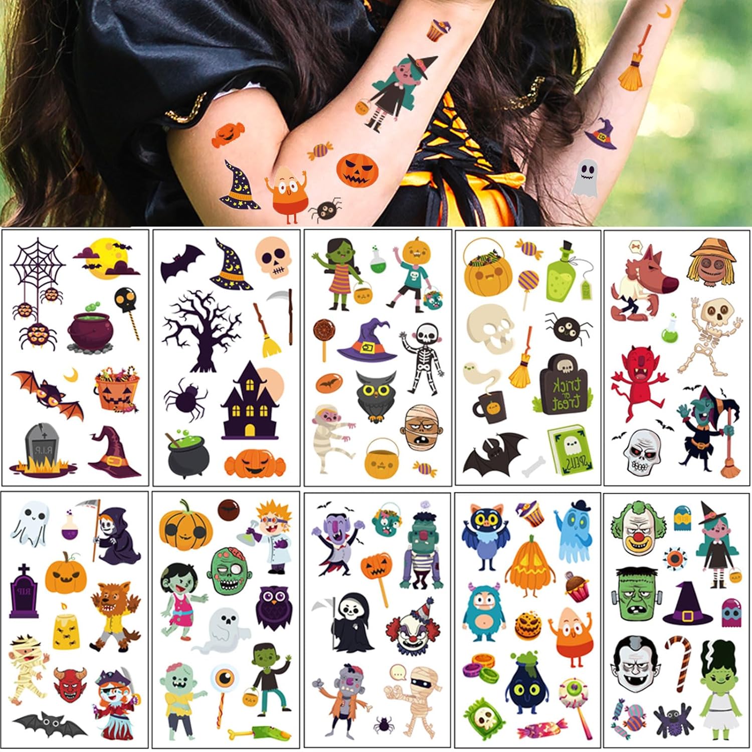 - 120 PCS Halloween Tattoos Cartoon Design - 11 Sheets 120pcs Different Style Halloween Tattoos Stickers Pattern For Kids Boys Girls Women Men. Pumpkins, ghosts, tombstones, castles, black cat, wizard hats, spiders, ghost hand and witch soup, which can add interesting Halloween atmosphere.Be unique to the party and help your kids share these Halloween tattoos with their friends