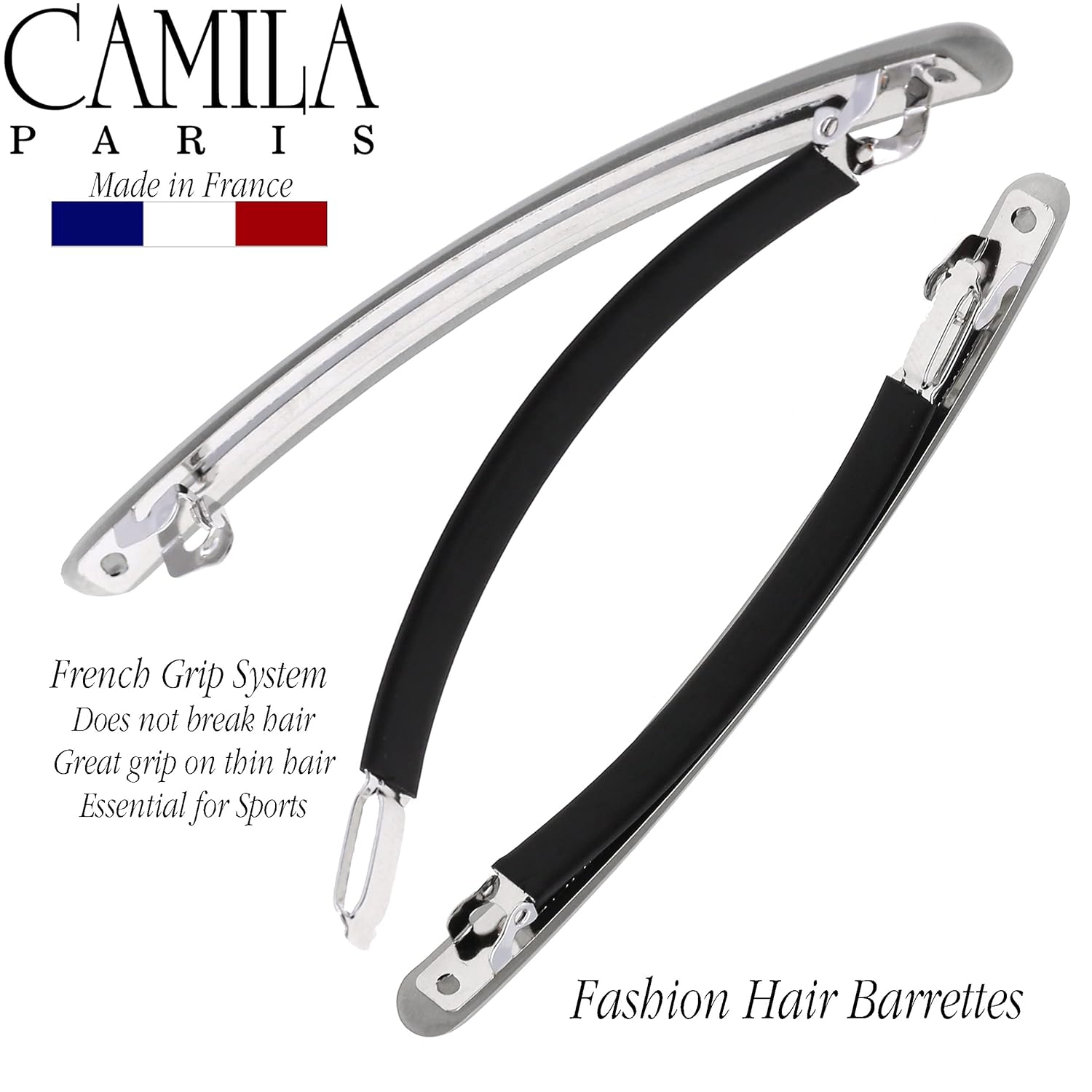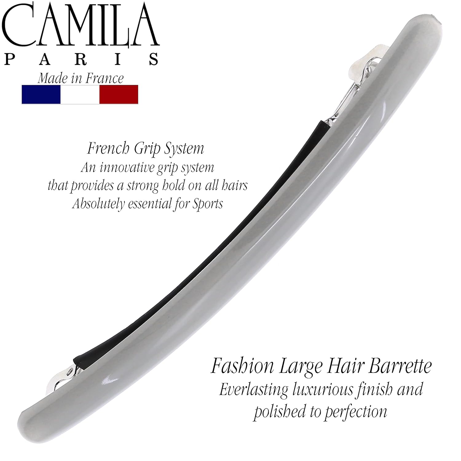 Camila Paris CP3252 French Hair Barrette Large Gray, Long Skinny Strong Hold Grip Hair Clips for Women, Thin Rubberized Automatic Clasp No Slip Durable Styling Girls Hair Accessories, Made in France