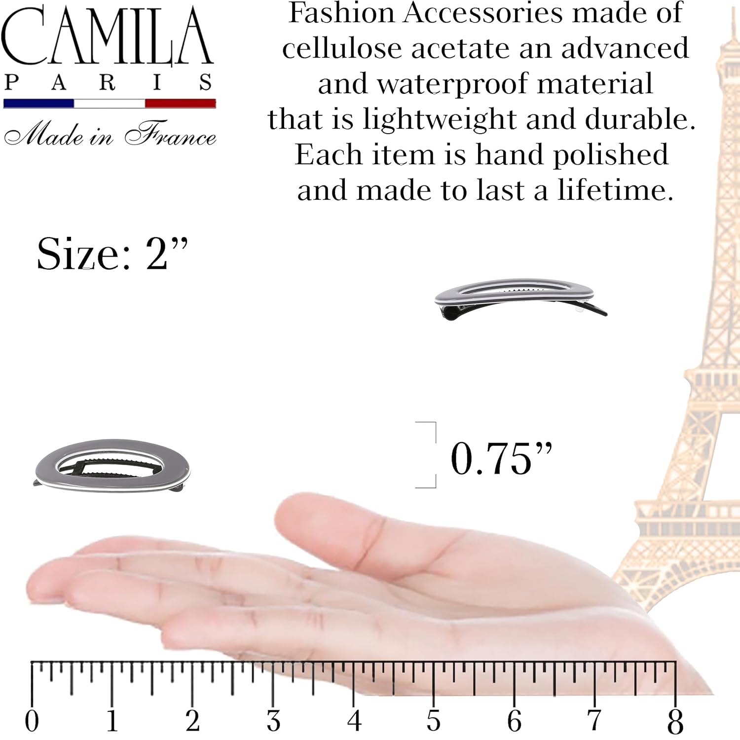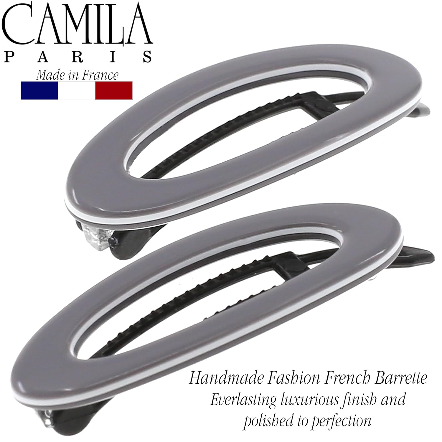 Camila Paris CP3368 French Hair Barrette Clip for Women, Handmade, Gray White, Side Slide-in Metal-Free Closure Strong Hold Grip Hair Clips for Girls, No Slip Durable Hair Accessories, Made in France