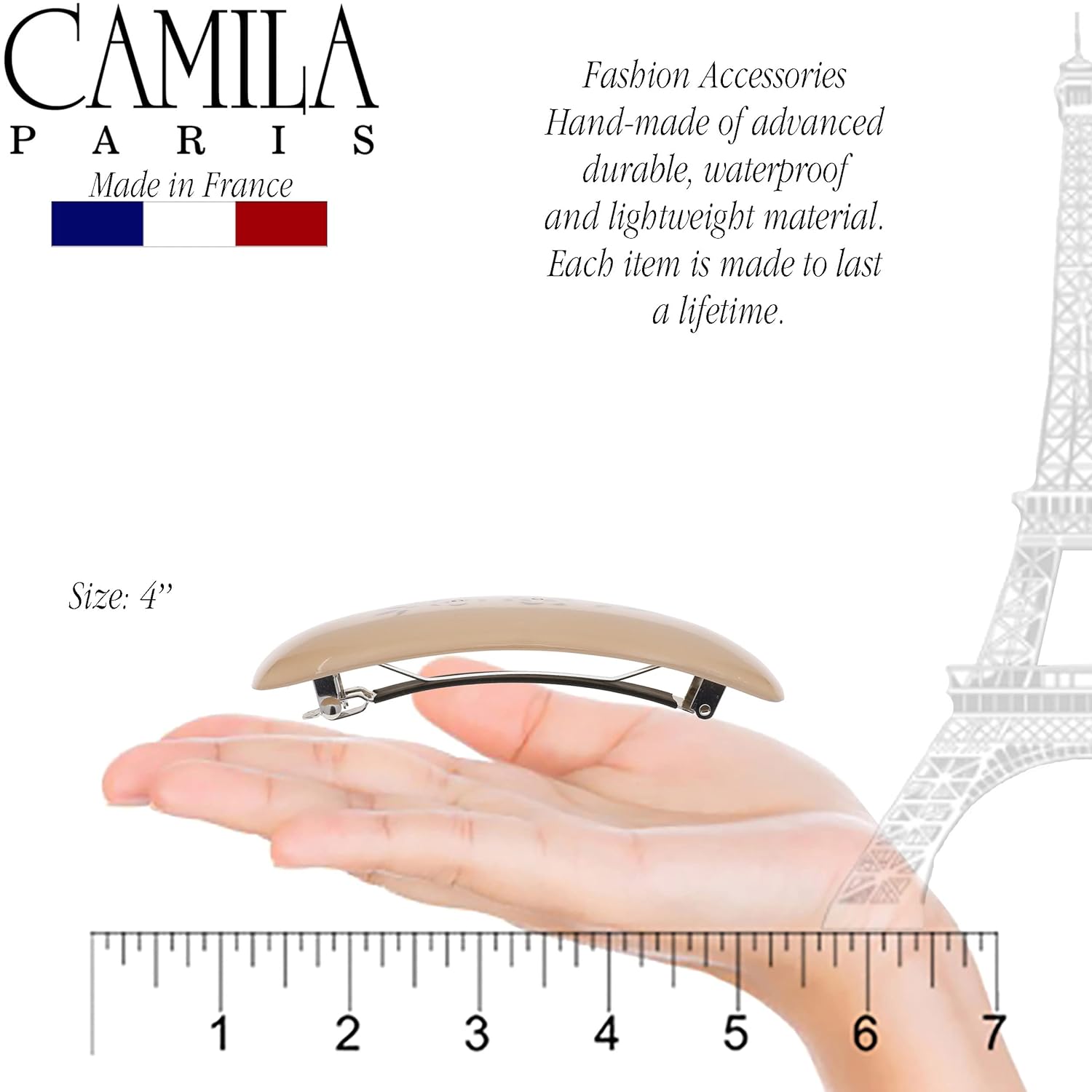 Camila Paris CP3438 French Hair Barrette Clip for Girls, Rubberized Automatic Clasp Strong Hold Grip Hair Clips for Women, No Slip and Durable Styling Girls Hair Accessories, Made in France (Beige)
