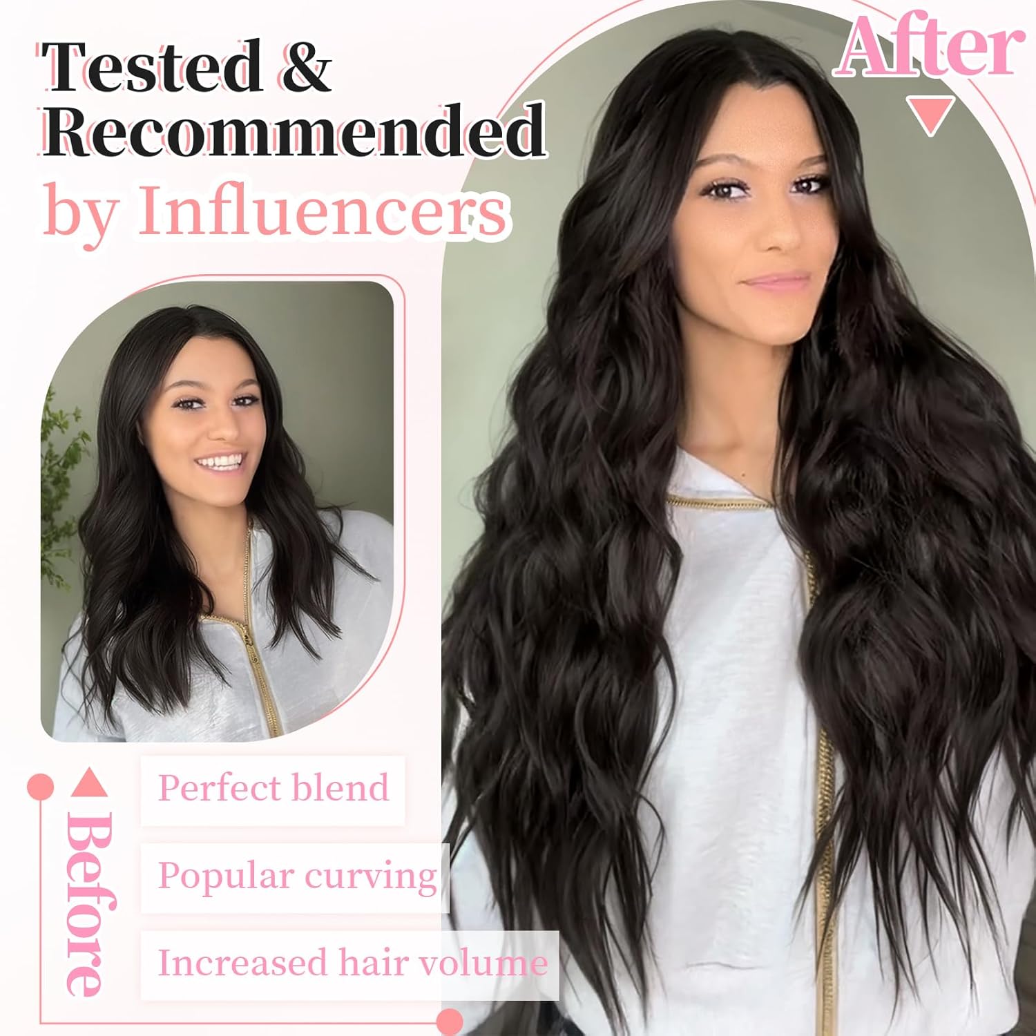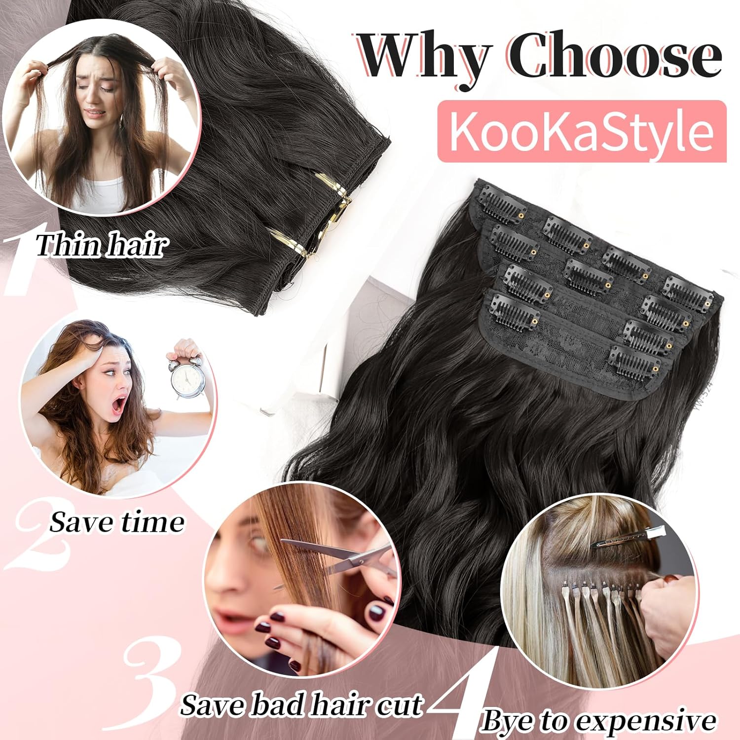KooKaStyle Clip in Long Wavy Synthetic Hair Extension 20 Inch 4PCS Dark Brown Hairpieces Fiber Thick Double Weft Hair Extension for Women
