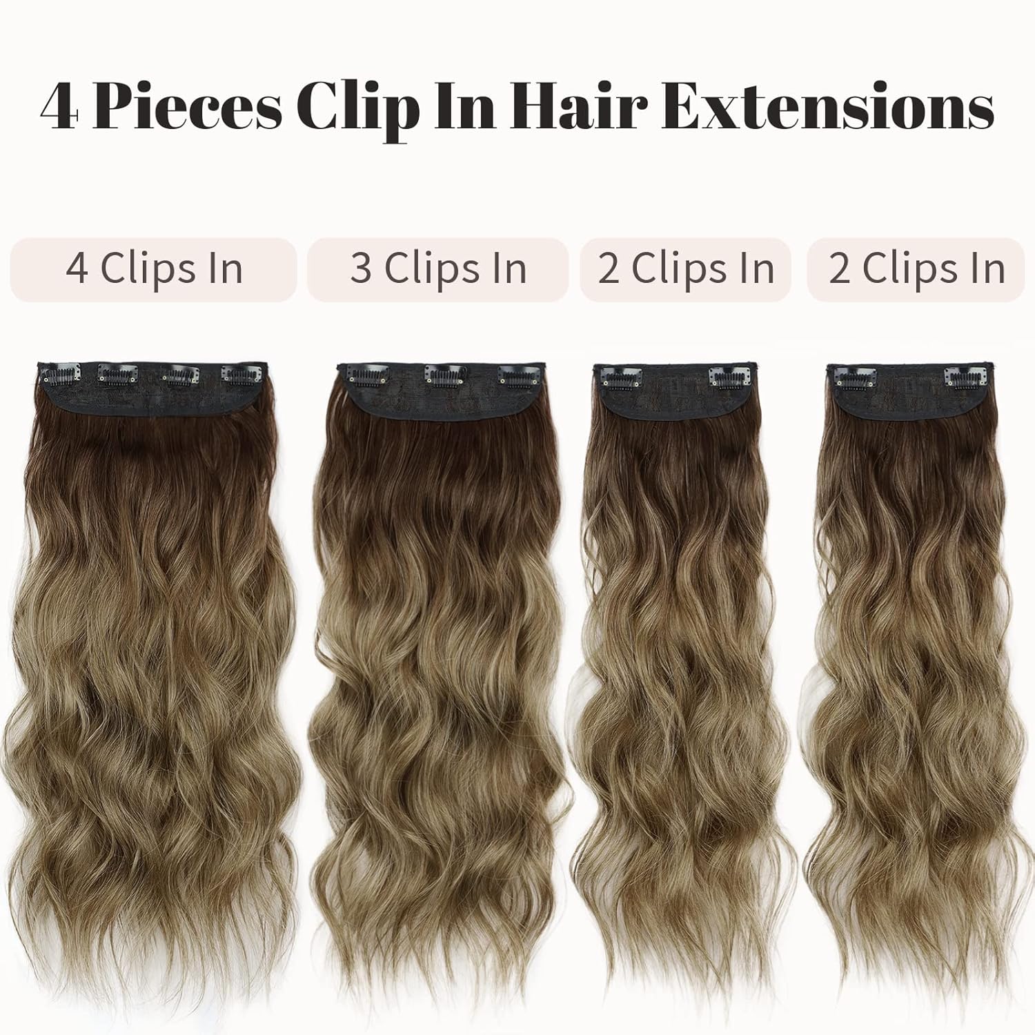 KooKaStyle Clip in Long Wavy Synthetic Hair Extension 20 Inch 4PCS Ombre Brown to Ash Blonde Hairpieces Fiber Thick Double Weft Hair Extension for Women
