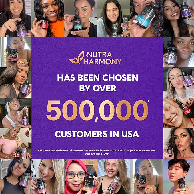 - Biotin with Hyaluronic Acid & Collagen Supplement — The Nutraharmony biotin supplement contains potent Biotin, Collagen, Keratin, and other essential nutrients that naturally support your health and beauty. Take two capsules a day with our highly bioavailable formula that promotes fast and proper absorption. Take care of your skin.