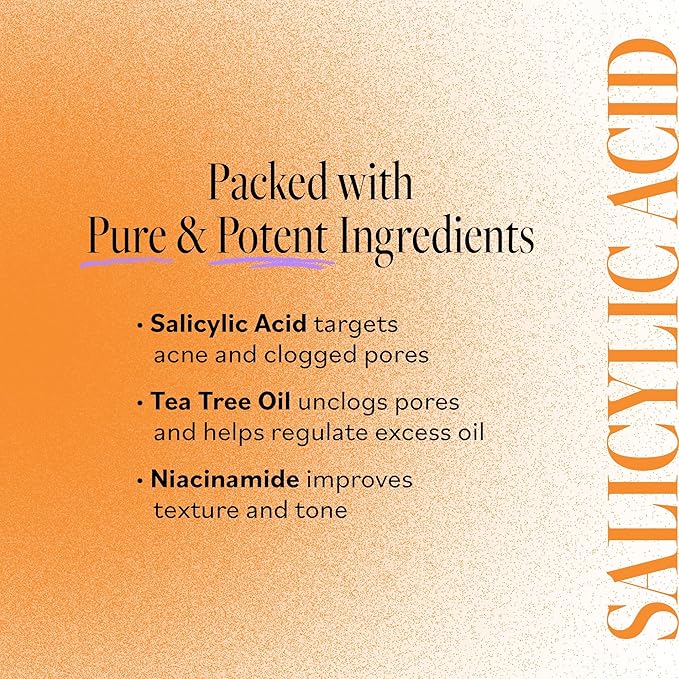 - NATURAL FORMULA: Packed full of powerful natural ingredients: Salicylic Acid, a beta hydroxy acid, helps skin cells shed more easily. Tea Tree Oil, Willow Bark Extract, calming Lavender, and Chamomile help to unclog pores and minimize redness