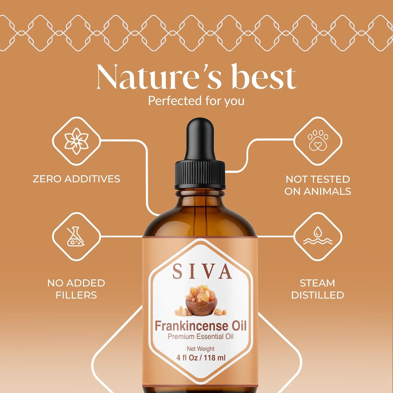 - Premium Quality Frankincense Essential Oil: SIVA Frankincense Oil 4oz is an essential oil and is obtained by steam distillation of Boswellia Serrata resin. SIVA Frankincense oil is free of preservatives and comes with a dropper for easy application. It is not tested on Animals. We care for you
