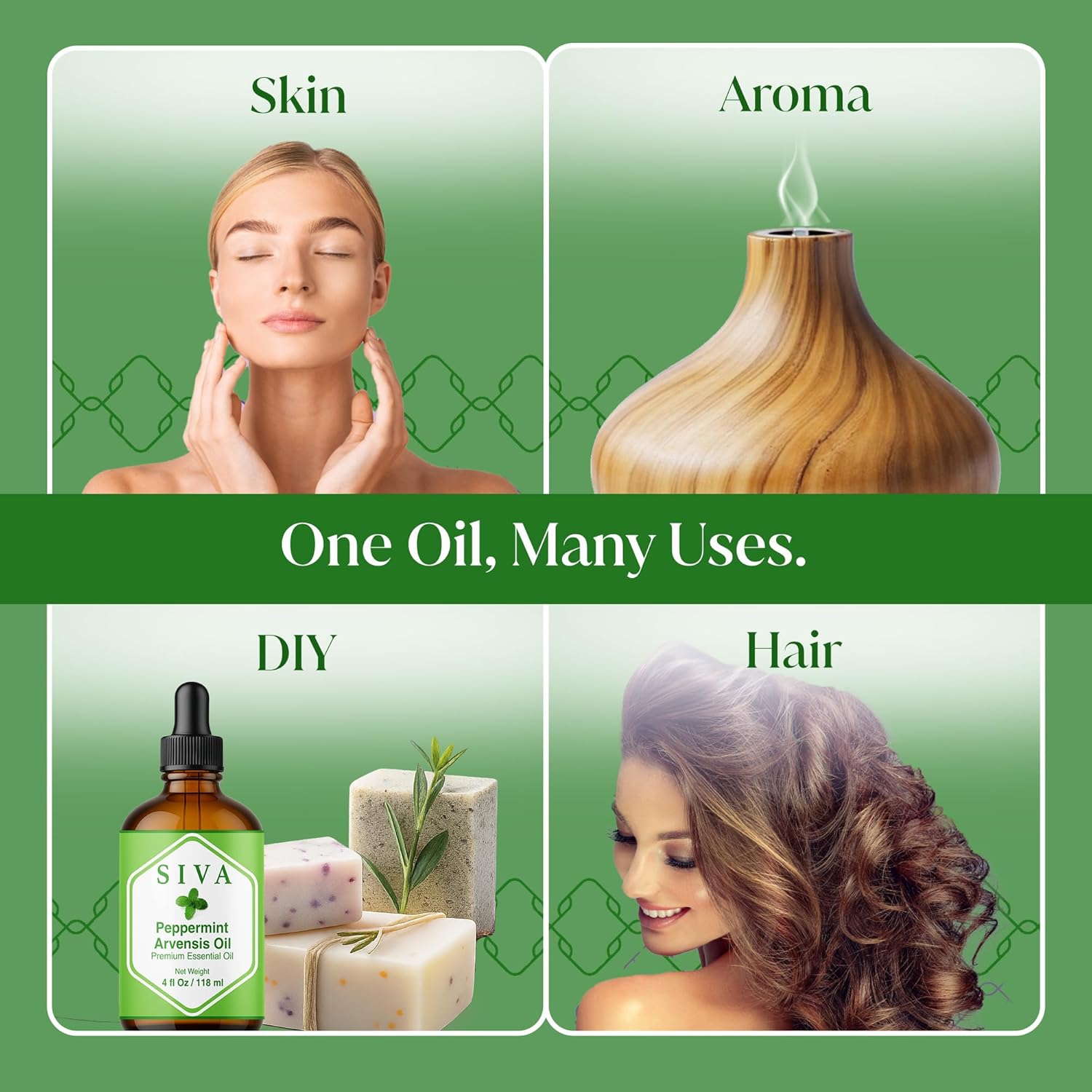 - Premium Quality Peppermint Arvensis Essential Oil: SIVA Peppermint Arvensis Oil 4oz is an essential oil and is obtained by steam distillation of Mentha Arvensis leaves. Our Peppermint Arvensis oil is free of preservatives and comes with a dropper for easy application. It is not tested on Animals. We care for you!