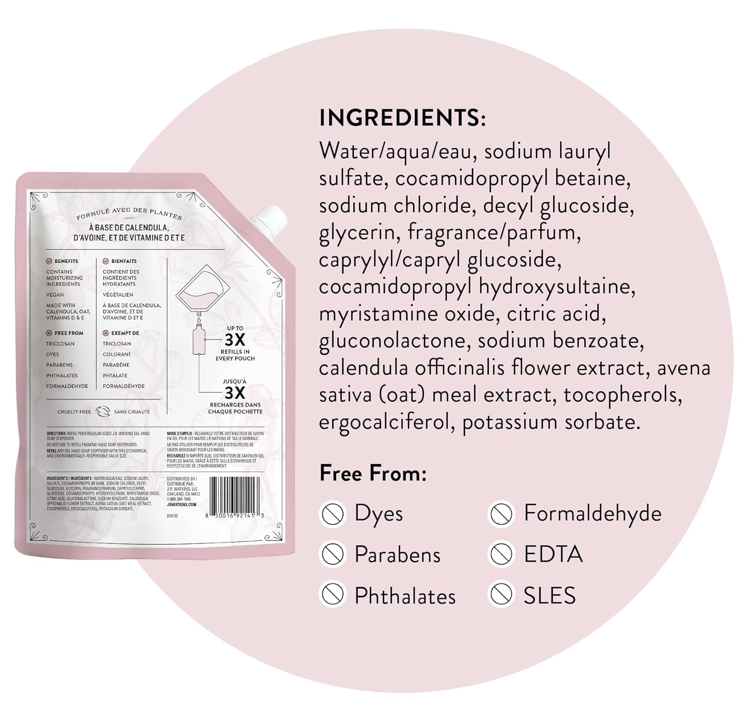 - BULK HAND SOAP : Have your favorite J.R Watkins hand wash soap always available with this refillable hand soap pouch pack, comes with a spout and enough liquid soap to fill your regular bottle up to 3 times each!