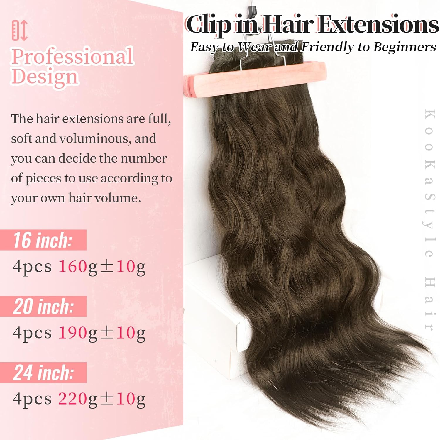 KooKaStyle Clip in Synthetic Hair Extensions Long Wavy 4PCS Thick Hairpieces Chestnut Brown Fiber Double Weft Natural Hair Extensions 24 Inch for Women