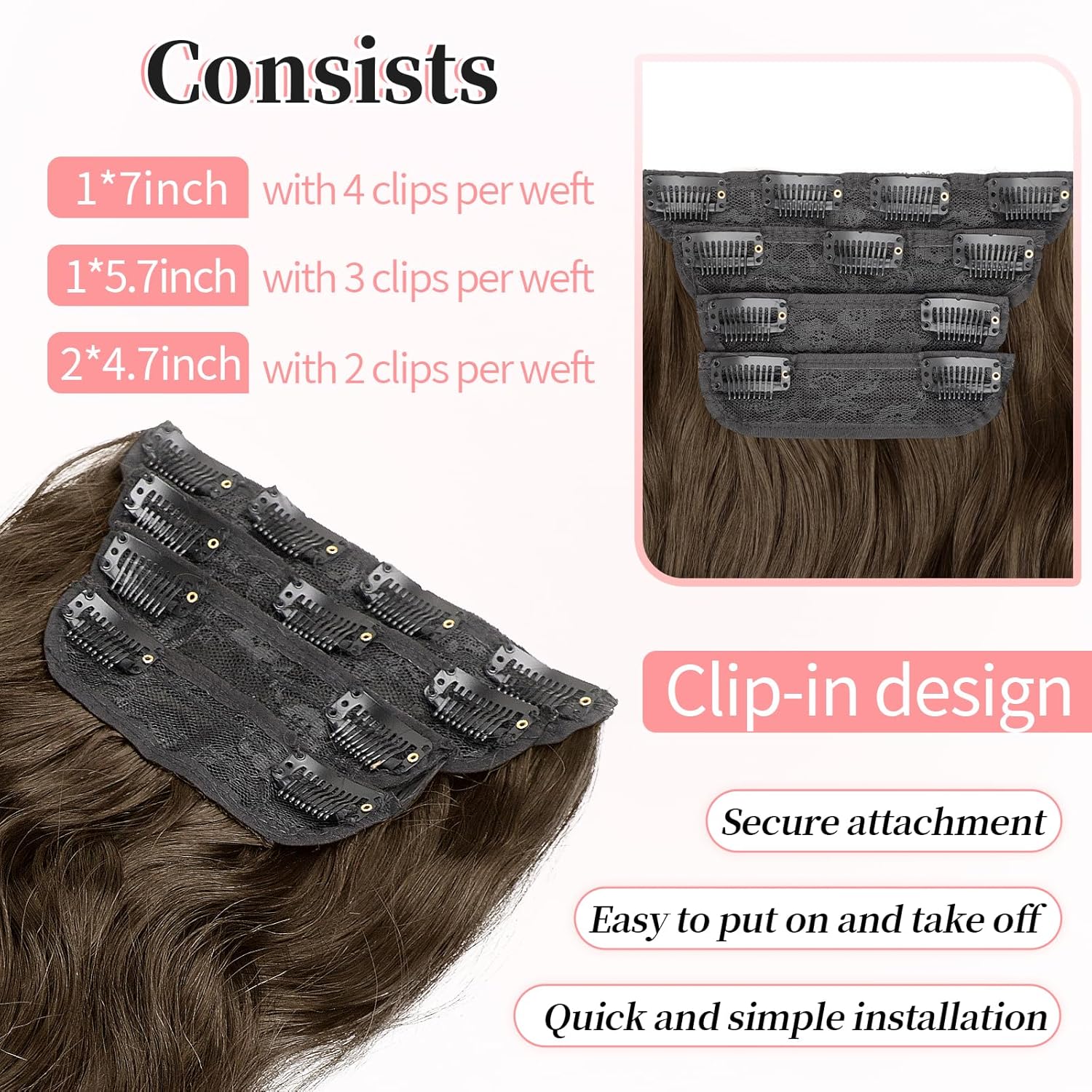- ๐ธใMore Volumeใ--At 220g 24 inches,Each pack includes: 2 pieces of 5 inches wide 2 clips in wefts; 1 piece of 6 inches wide 3 clips in weft; 1 piece of 7 inches wide 4 clips in weft.