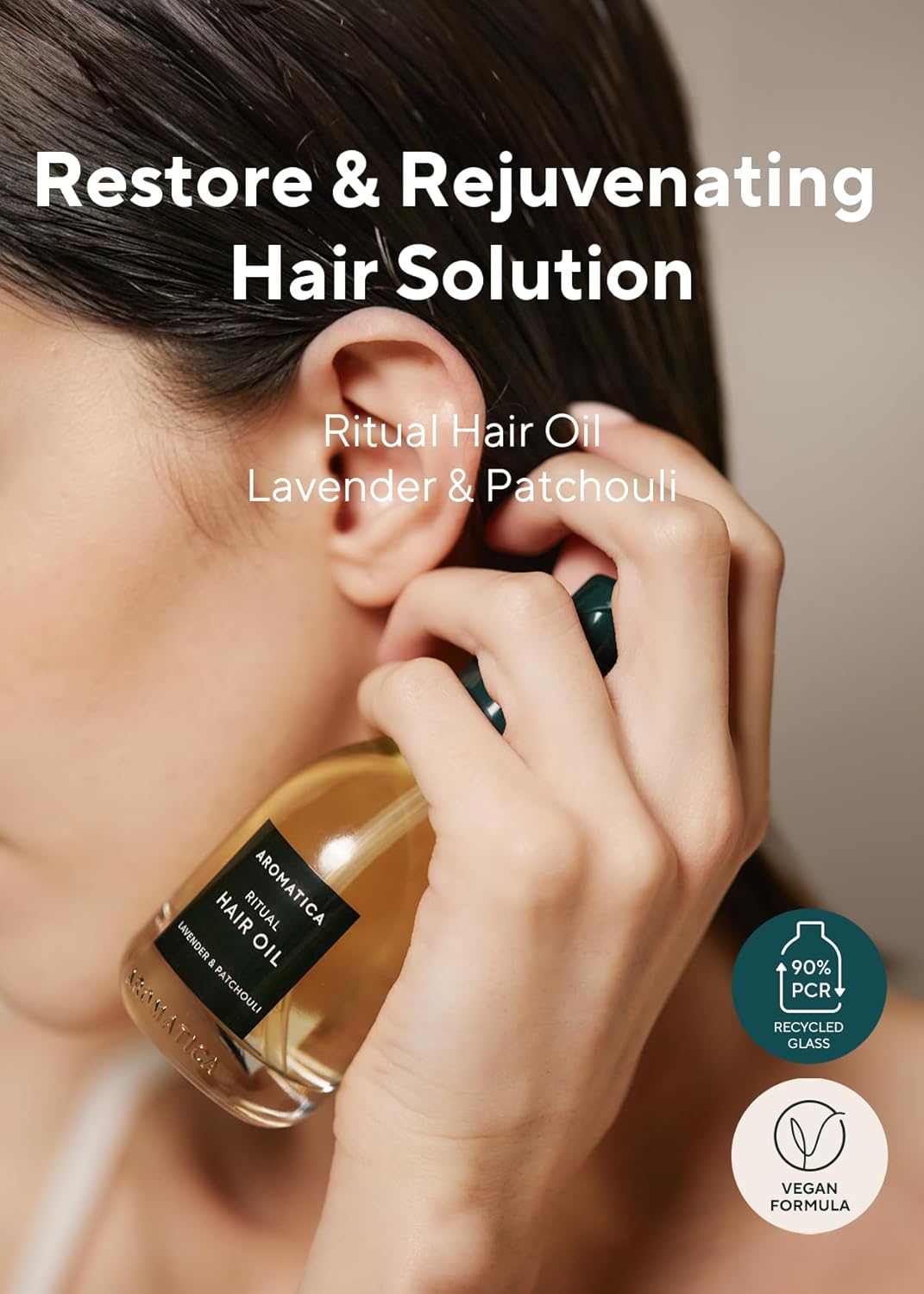 AROMATICA Ritual Lavender & Patchouli Hair Oil - Adds Shine and Smooths Split Ends - Blow Out Hair Serum for Damaged & Frizzy Hair - Nourishing for Dry Curly Hair - Silicone-Free (1.6 fl oz)