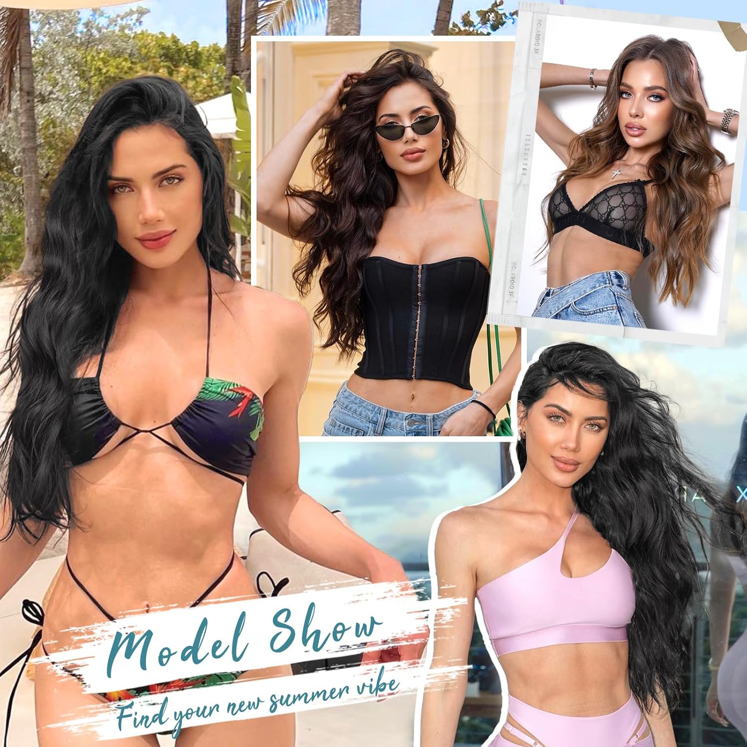 KooKaStyle Clip in Synthetic Hair Extensions Long Wavy 4PCS Thick Hairpieces Black Fiber Double Weft Natural Hair Extensions 16 Inch for Women