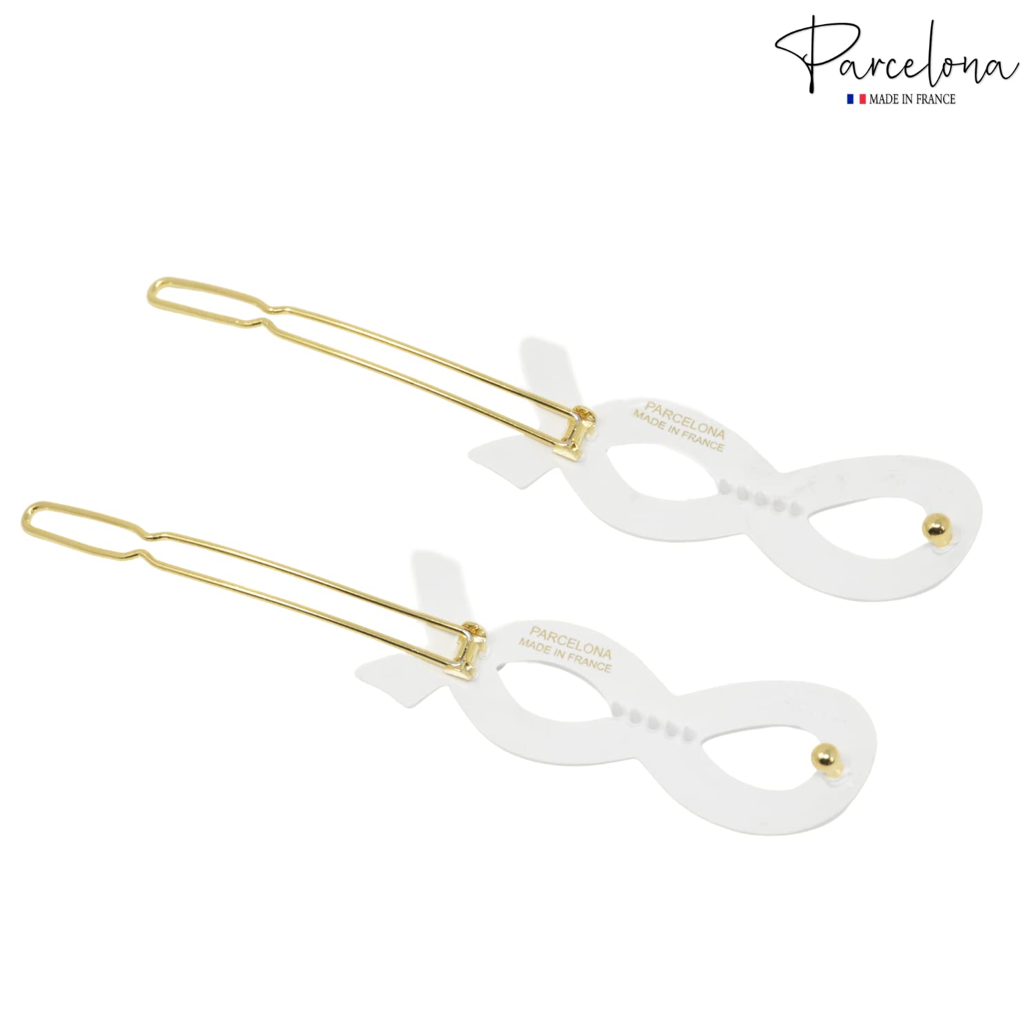 - The French infinity shape hair clip barrettes are a prime example of classic French design, simple yet elegant for women's hair accessories. These side clips feature strong tige boule golden clasp mechanism to hold hair in place and gives you quick styling solutions with non-slippery grip. The size of barrette is approx. 2.25 inch x 0.75 inch (5.75 cm x 2 cm).